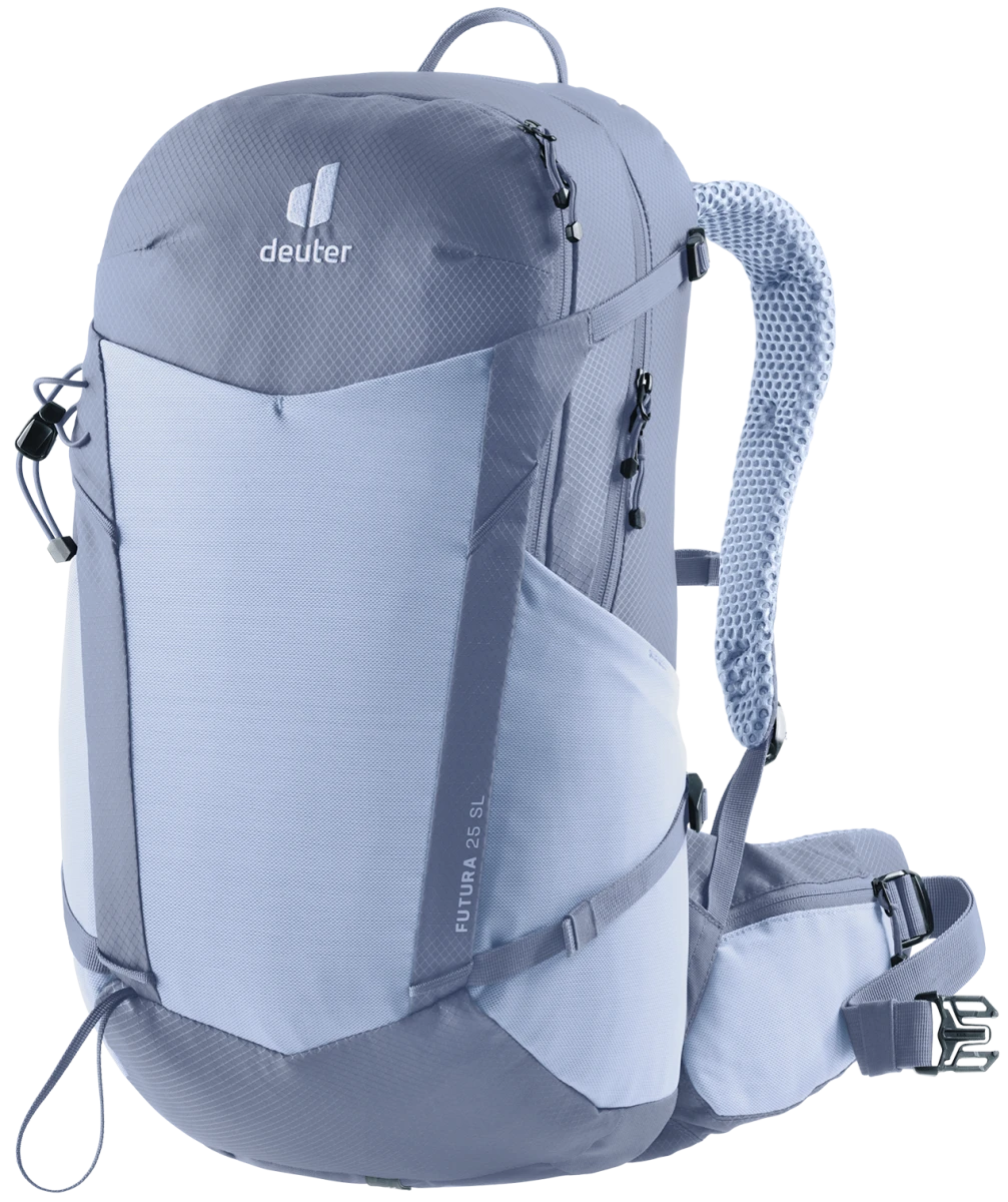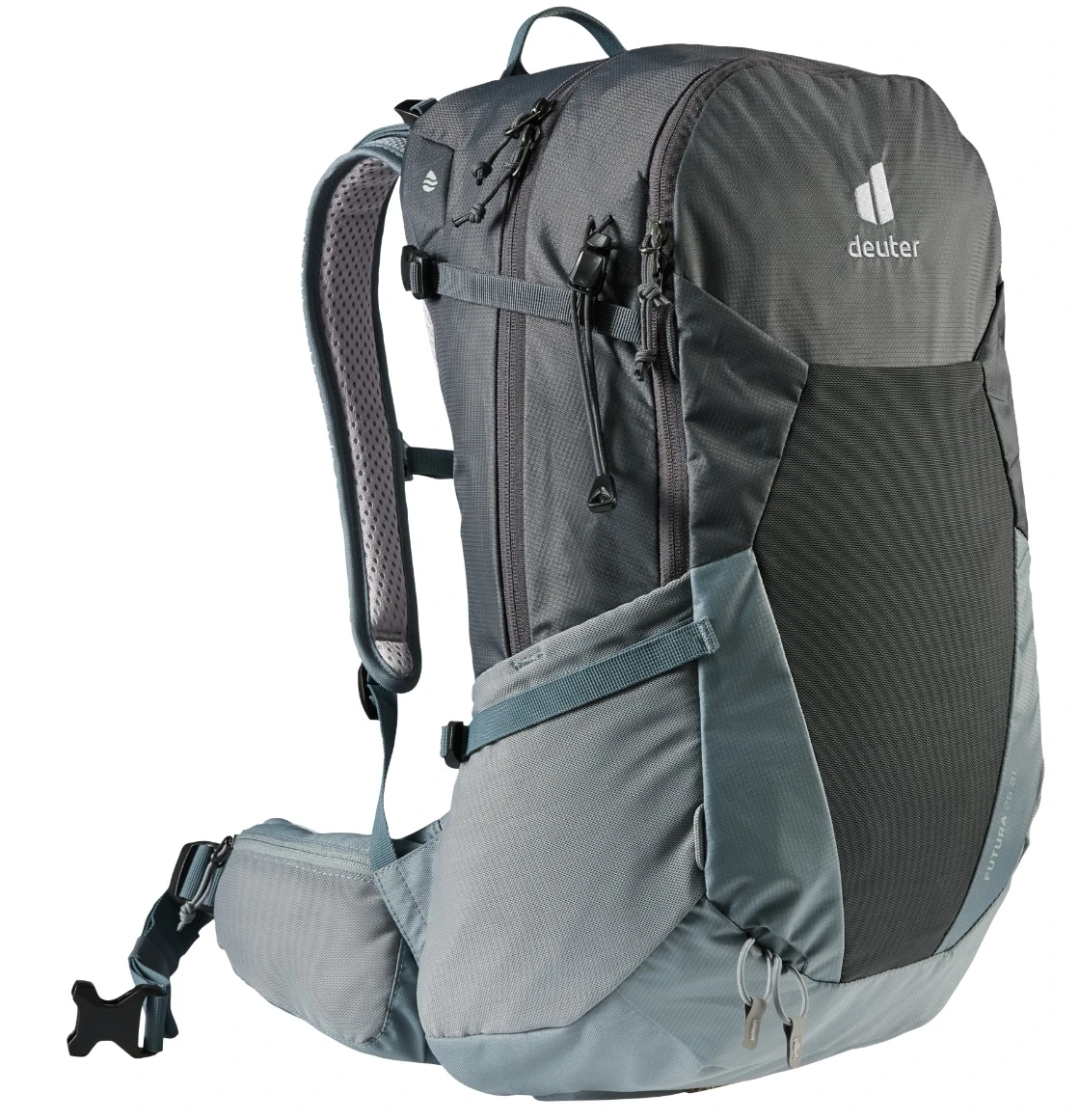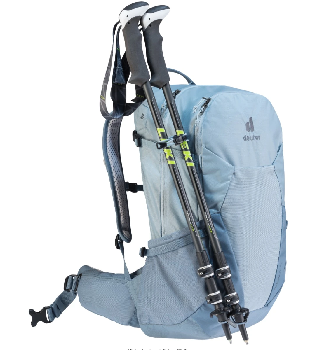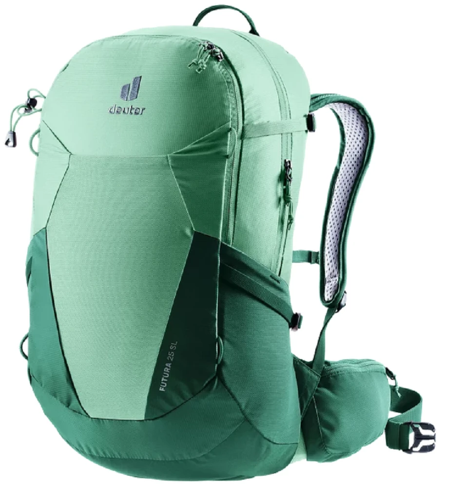 Dámský batoh na turistické aktivity Deuter Futura 25 SL: je zajímavý pro turistiku po městech, v přírodě i v horách. Má dámskou konstrukci, která má kratší zádový systém, blíže k sobě ramenní popruhy a upravený bederní pás.