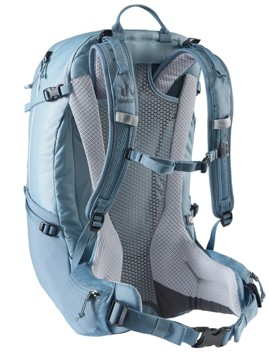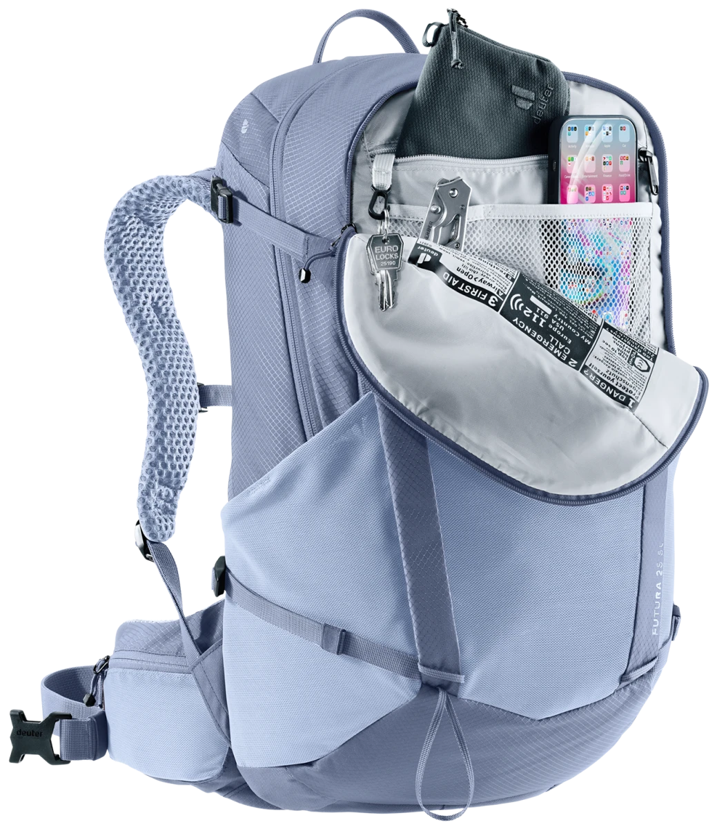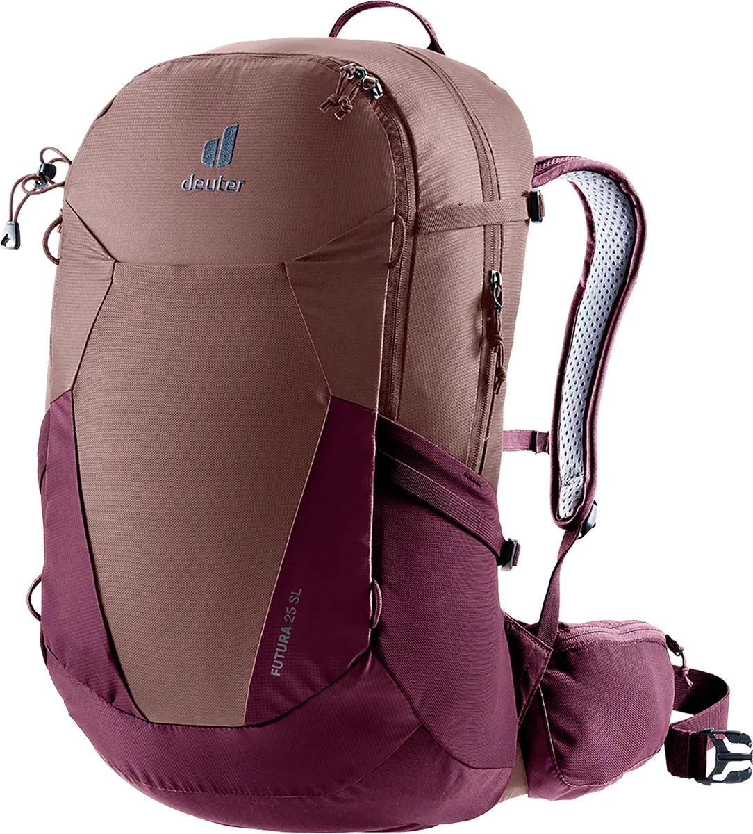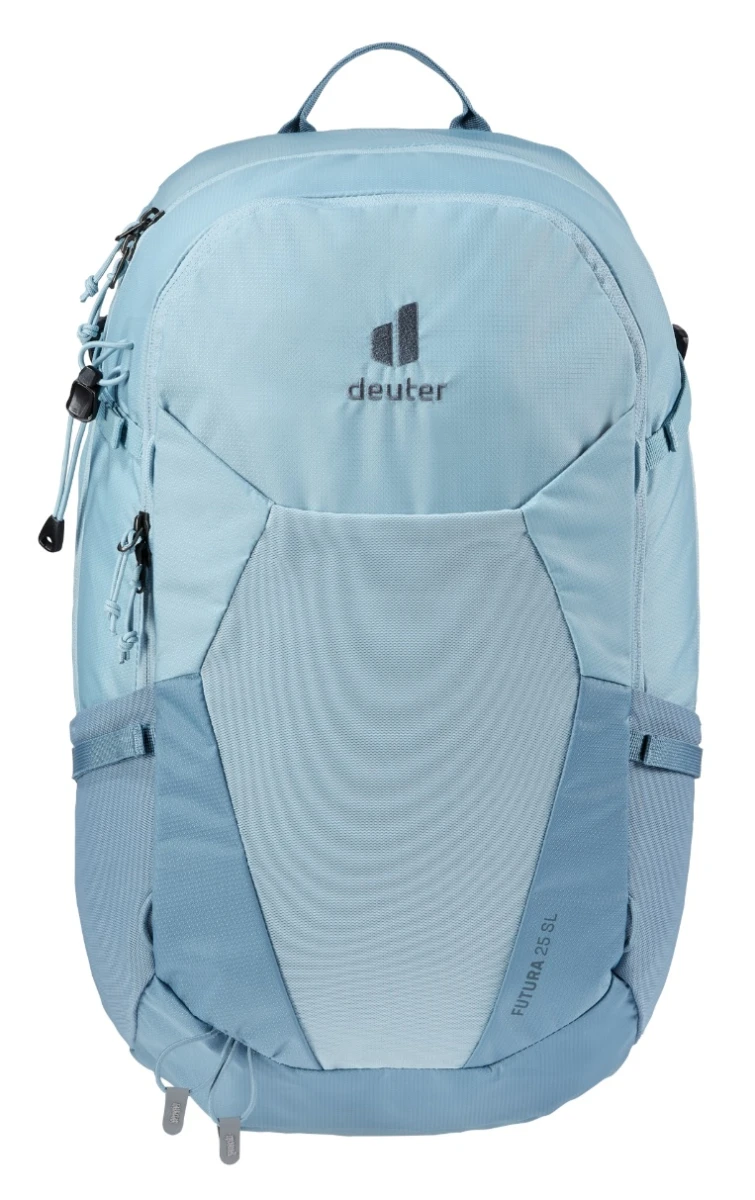Dámský batoh na turistické aktivity Deuter Futura 25 SL: je zajímavý pro turistiku po městech, v přírodě i v horách. Má dámskou konstrukci, která má kratší zádový systém, blíže k sobě ramenní popruhy a upravený bederní pás.