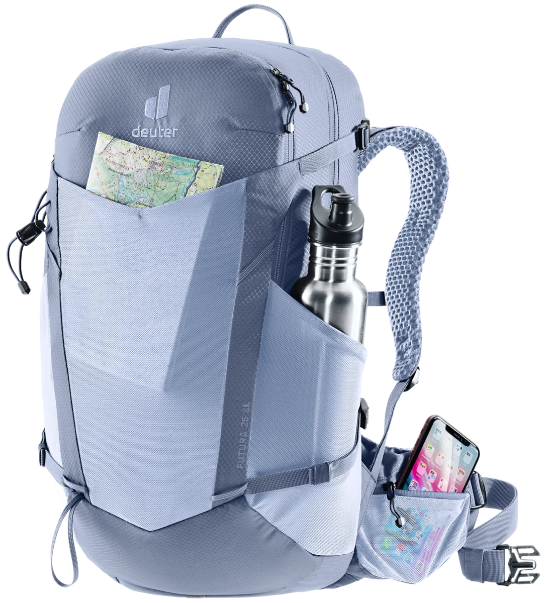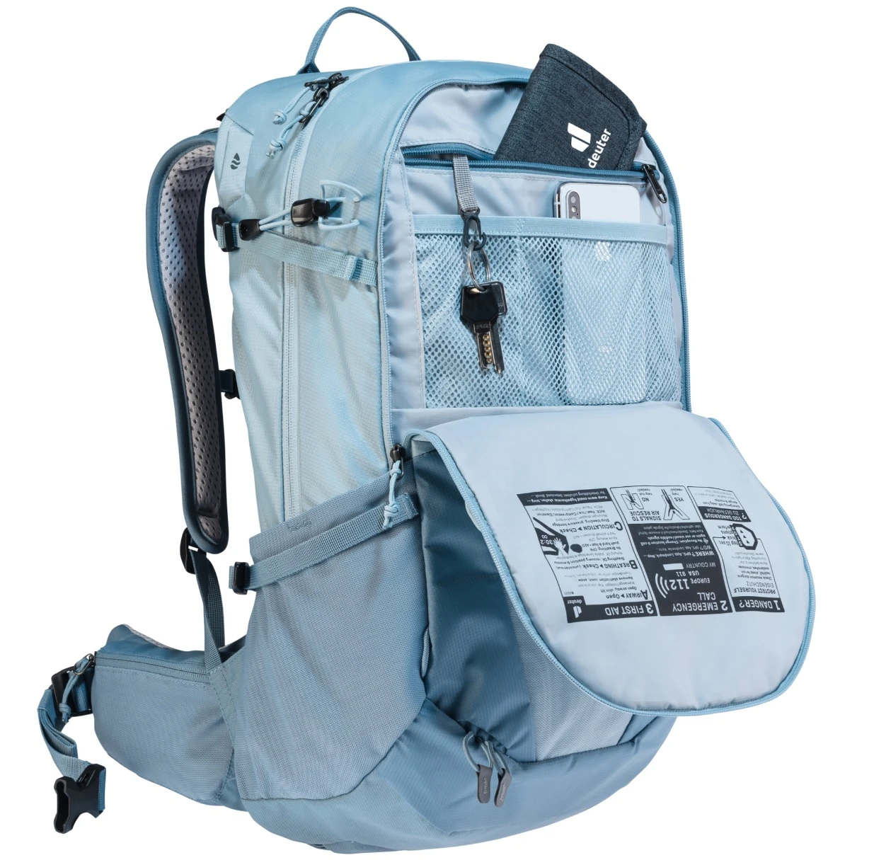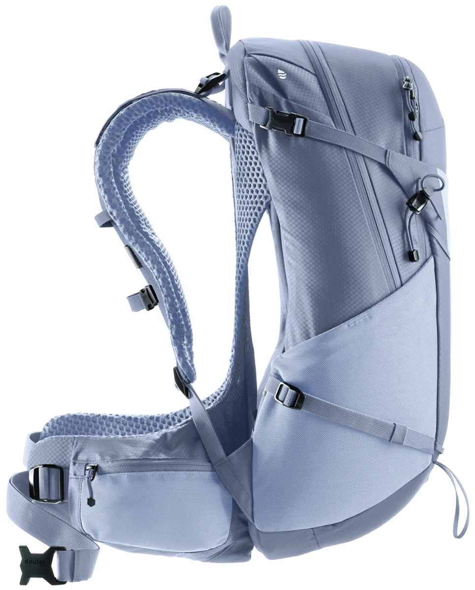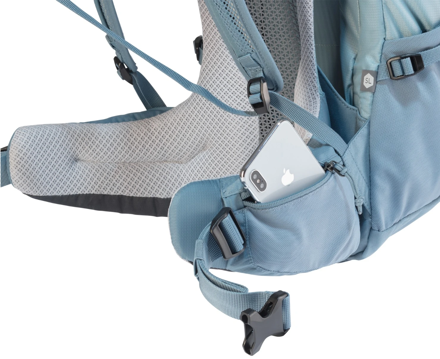 Dámský batoh na turistické aktivity Deuter Futura 25 SL: je zajímavý pro turistiku po městech, v přírodě i v horách. Má dámskou konstrukci, která má kratší zádový systém, blíže k sobě ramenní popruhy a upravený bederní pás.