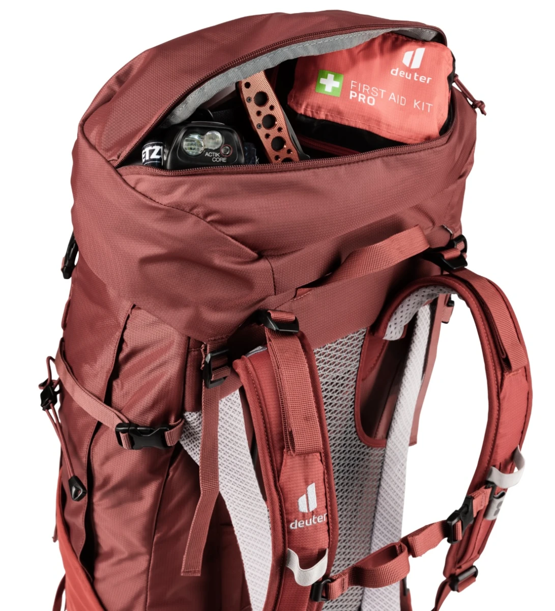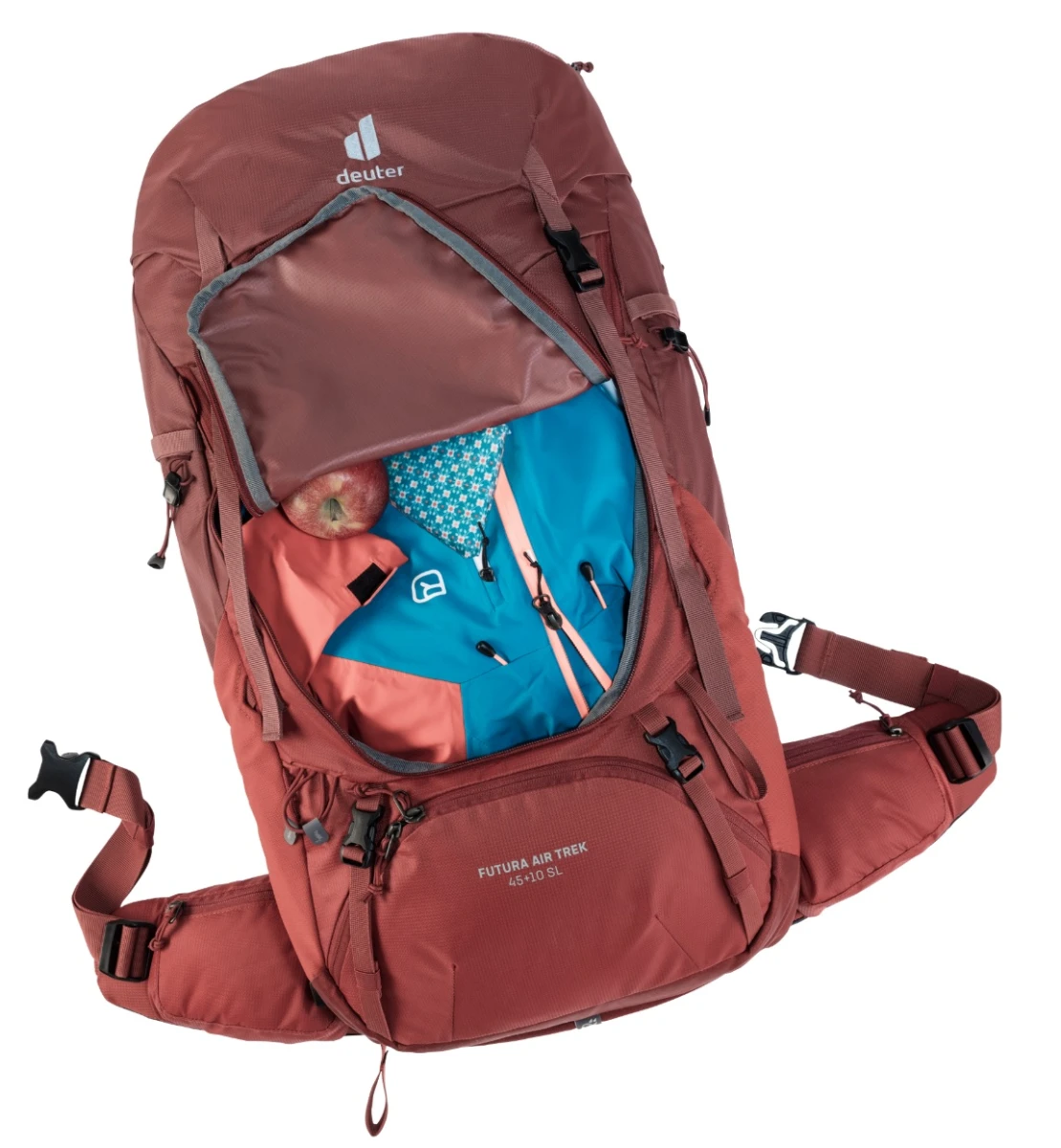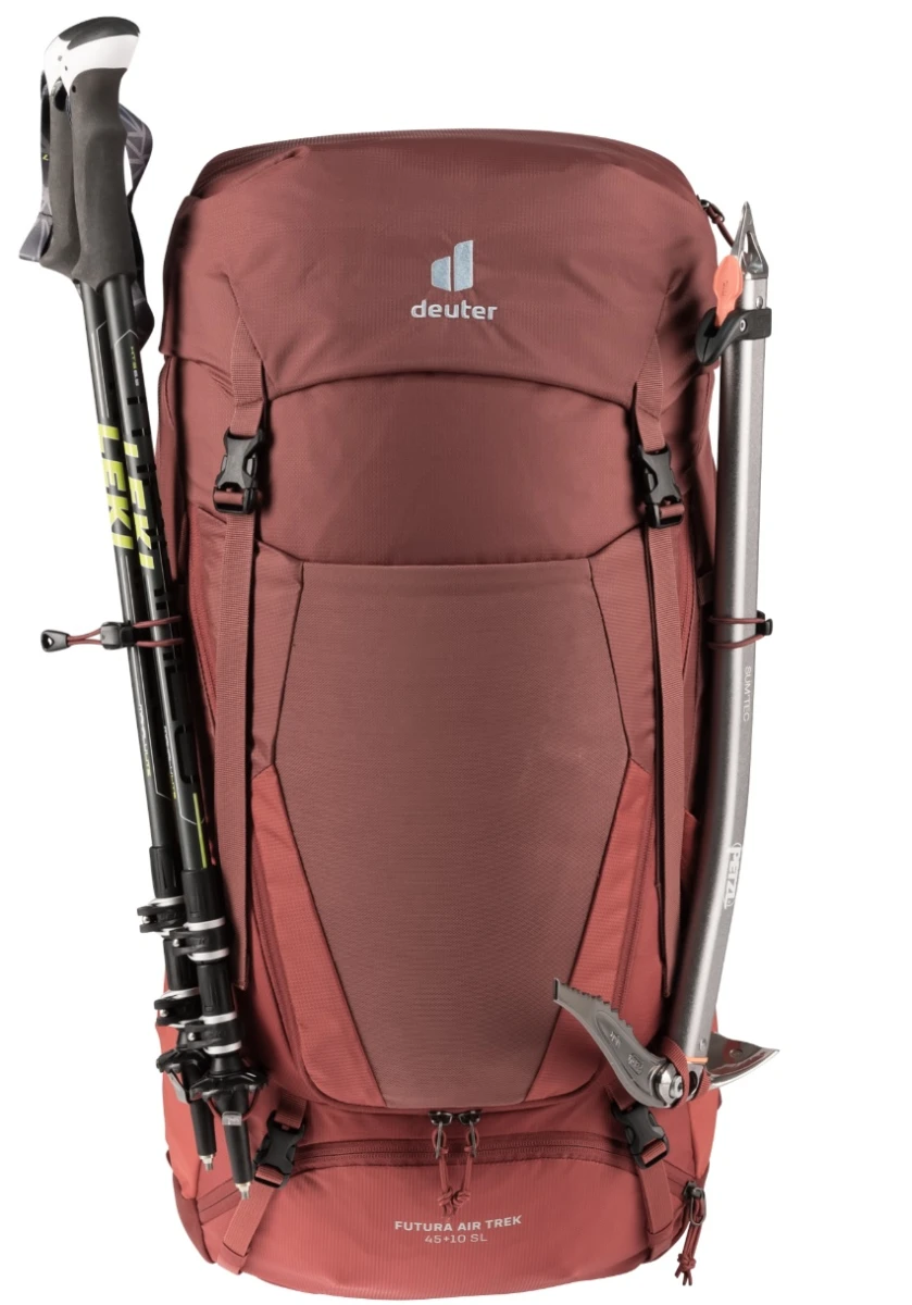 Deuter Futura Air Trek 45+10 SL: dámský turistický batoh střední velikosti je vysoce prodyšný a zároveň velmi pohodlný. Má objem 45+10 litrů, takže vám poskytne celkový objem až 55 litrů. Je tak ideální na všechny vaše výpravy do hor na několik dní, a to i v letních měsících. Batoh byl navržen speciálně pro ženy, takže tu najdete kratší zádový systém se síťkou, který lze podle potřeby jednoduše nastavit. Užší ramenní popruhy jsou polstrovány ergonomickými vložkami, které se postarají o rozložení váhy.