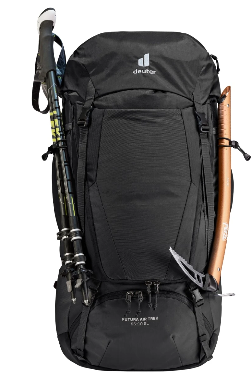 Deuter Futura Air Trek 55+10 SL: pohodlný turistický batoh, určený pro ženy a lidi s drobnější postavou. Hodí se na všechny turistické výpravy do hor. Jeho objem je 55+10 litrů. Vejdou se vám do něj, všechny vaše věci, které byste mohli při pobytu potřebovat. Batoh má kratší zádový systém Aircomfort Sensic se síťkou, což zaručuje maximální proudění vzduchu. Navíc si ho můžete jednoduše nastavit podle výšky vaší postavy. Ramenní popruhy jsou užší a polstrované. Dostatek pohodlí vám také zajistí pohybliví bederní pás, s kapsičkou na mobilní telefon.