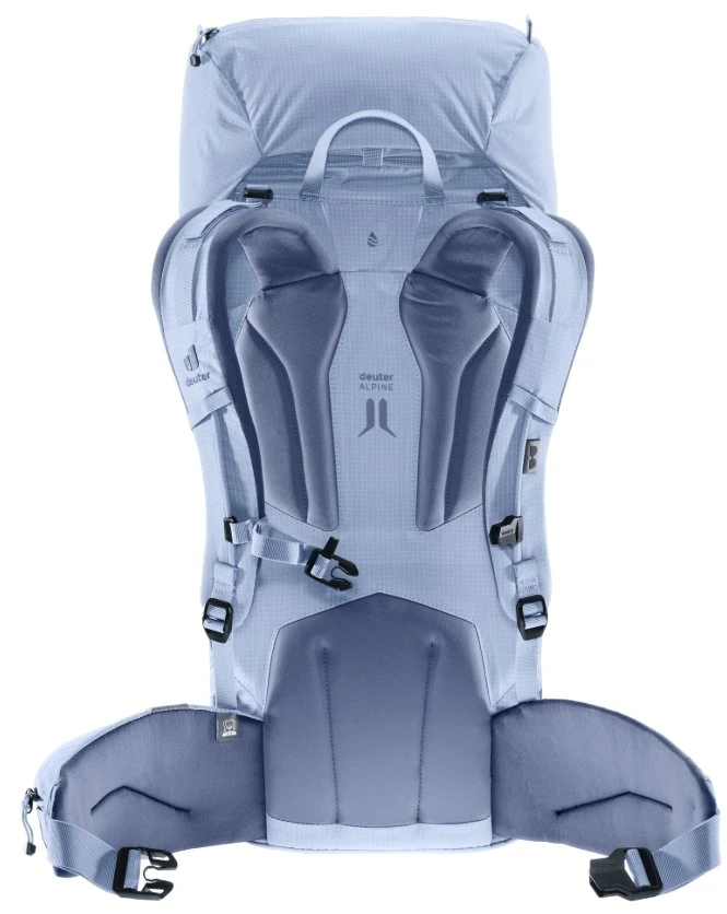Zádový systém Alpine: Přiléhavý systém drží těžiště nákladu co nejblíže u těla, což je klíčové pro rovnováhu v technickém terénu. Polstrování zajišťuje komfort a stabilitu i při plném naložení.
