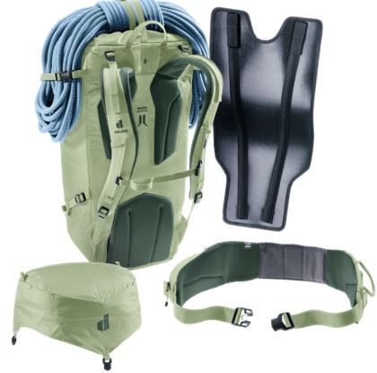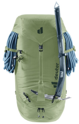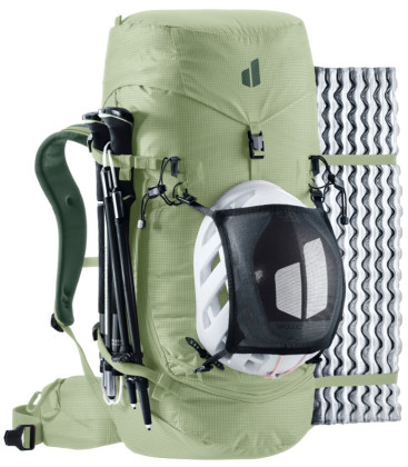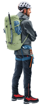 Fixace materiálu: Vylepšený systém pro uchycení dvou cepínů, boční popruhy pro lyže (A-frame) a integrovaný držák na helmu (helmet holder).