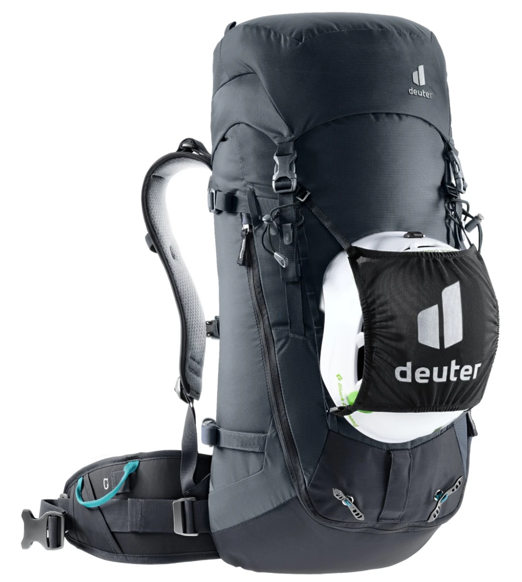 Deuter Guide 34+ : je bytelný batoh pro horolezce vyrobený z odolného materiálu. Má velikost rozšířitelnou až na 42 litrů. Základem je dobrý zádový systém Deuter Alpine, jednoduchá konstrukce, odpojitelný bederní pás a vyztužující vložka na zádech. Celý systém je založen na rámu ve tvaru písmene V.
