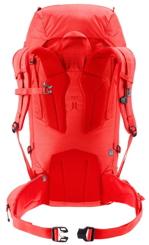 Zádový systém Alpine: Přiléhavé polstrování s hliníkovou výztuhou ve tvaru X efektivně přenáší váhu na boky a udržuje stabilitu v náročném terénu. Systém je navržen tak, aby neomezoval v pohybu při lezení či práci s materiálem.