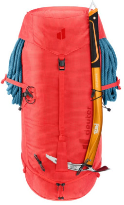 Fixace lana: Pod víkem se nachází stahovací popruh, který zajistí stabilní polohu lezeckého lana i při pohybu.