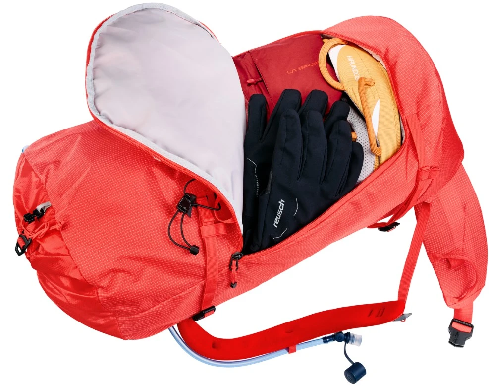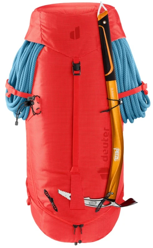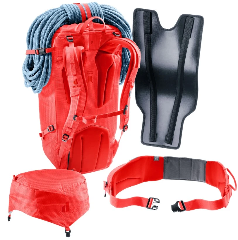 Lano a výstroj: Pod víkem je integrován popruh pro stabilní připevnění lezeckého lana. Na bederním pásu naleznete poutka na lezecký materiál (karabiny, expresky).