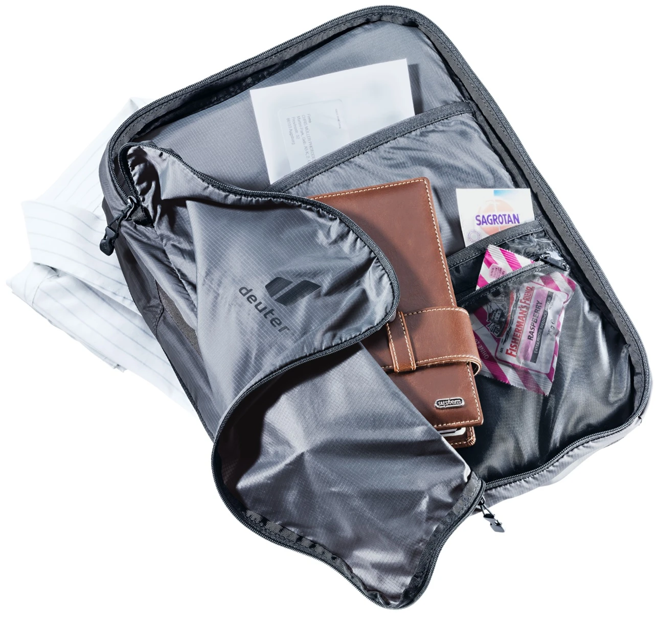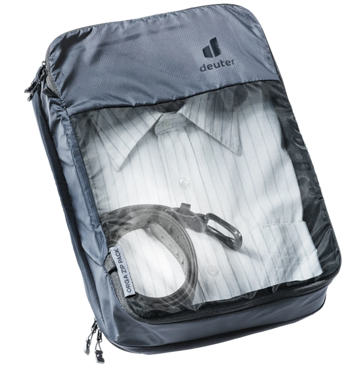 Deuter Orga Zip Pack: Praktický cestovní organizátor, který vám umožní mít přehled ve věcech. Hodí se jako malé zavazadlo do kufru nebo velké cestovní tašky. Má dvě části oddělené přepážkou. Zadní kapsa je vyrobená z materiálu mesh, a je vhodná pro uložení oblečení. Přední síťovaná kapsa na zip dobře poslouží na drobné předměty, doklady a cestovní dokumenty.