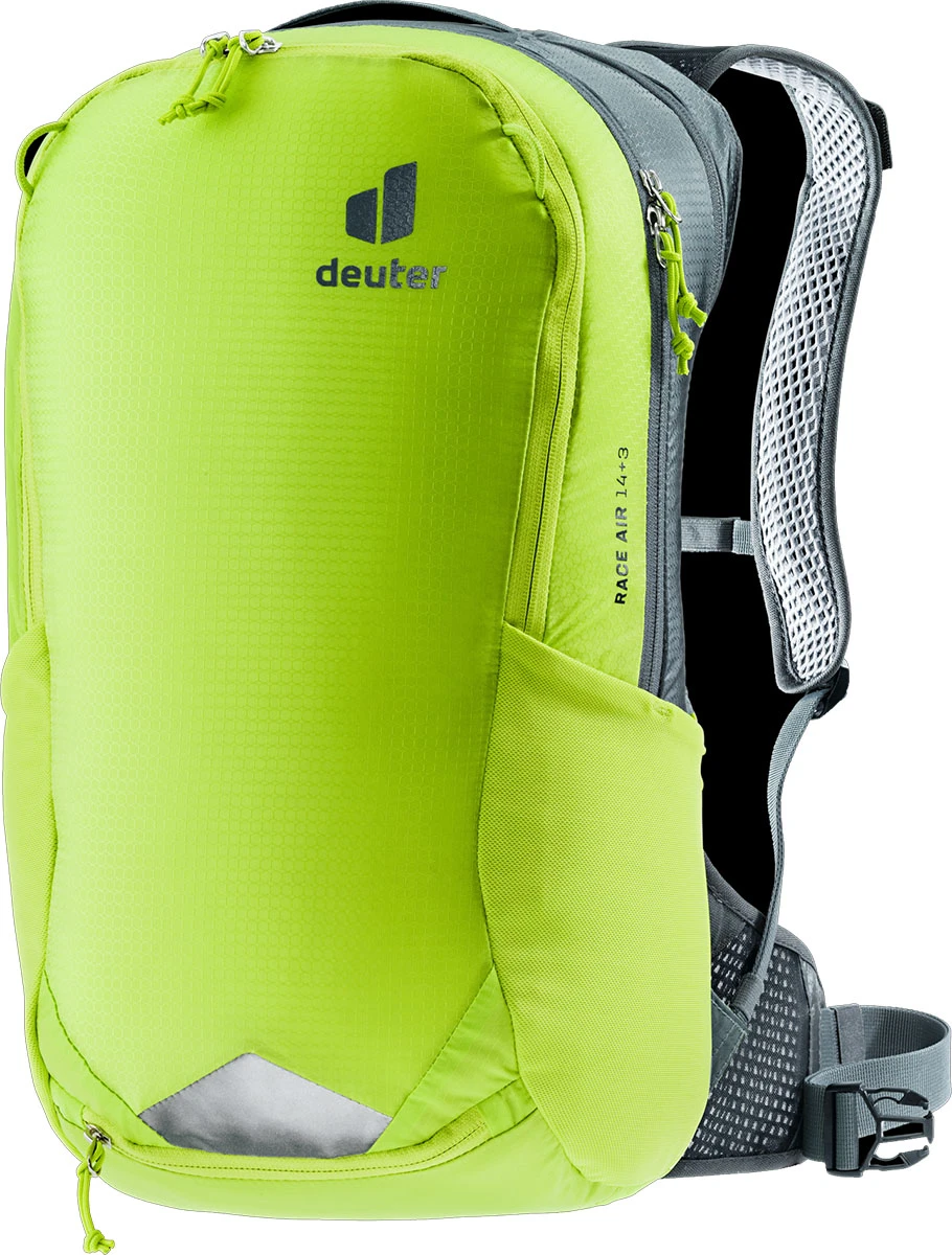 Deuter Race Air 14+3: je cyklistický batoh se zády tvořenými síťkou pro co nejlepší prodyšnost o objemu 14 litrů, který je možné rozepnutím zipu zvětšit na 17 litrů.