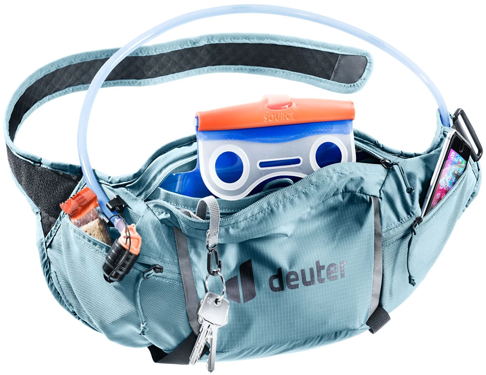 Deuter Shortrail III: je běžecká pásek na doklady, peníze nebo klíče od auta a samozřejmě i vodní vak. Do vyztužené kapsy vložíte vodní vak, na ledvinku je možné upevnit běžecké hole. Do velké kapsy dáte bundu.