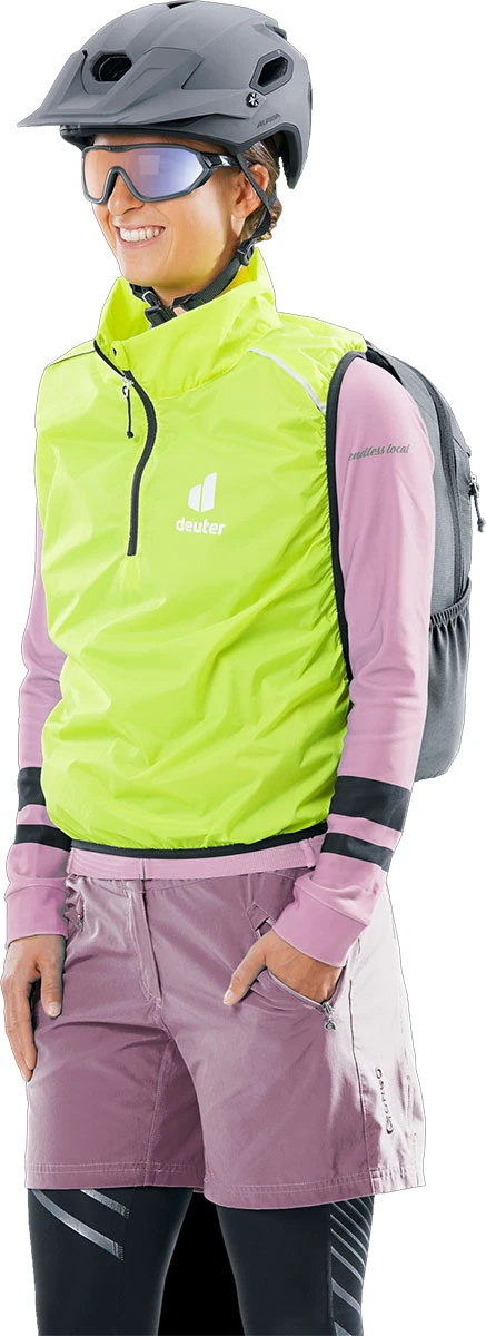 Batoh má integrovaná větru odolnou cyklistickou reflexní vestu, pláštěnku pro případ deště, síťku na helmu.