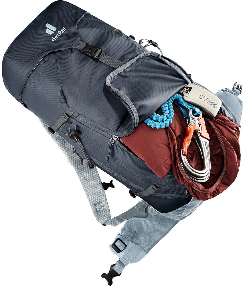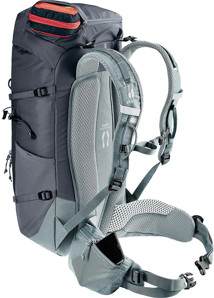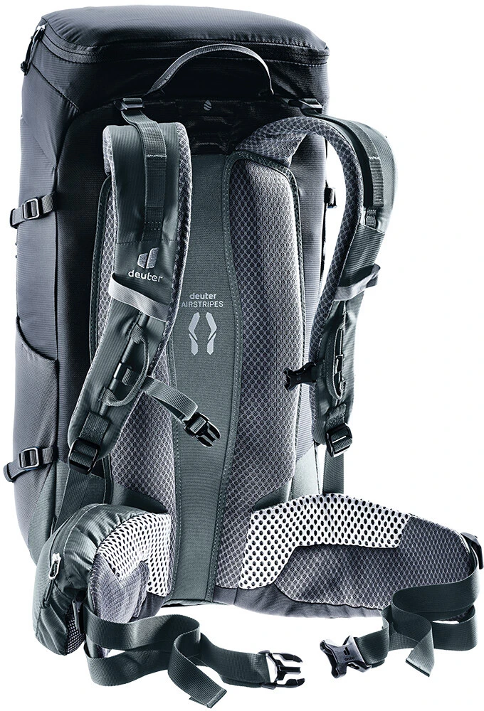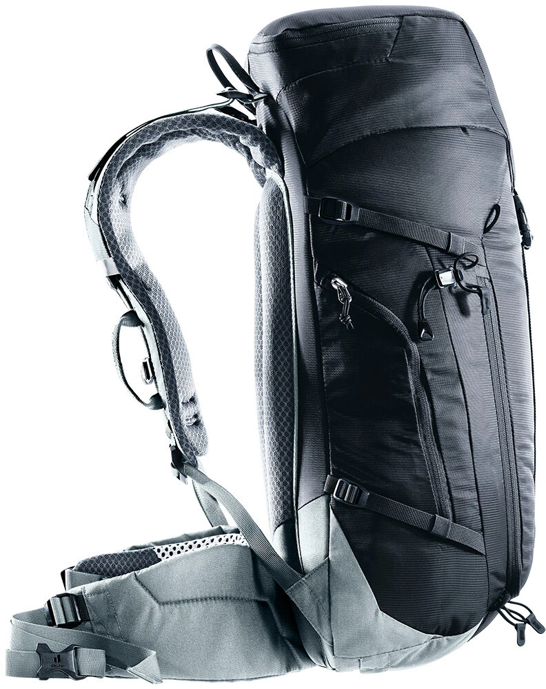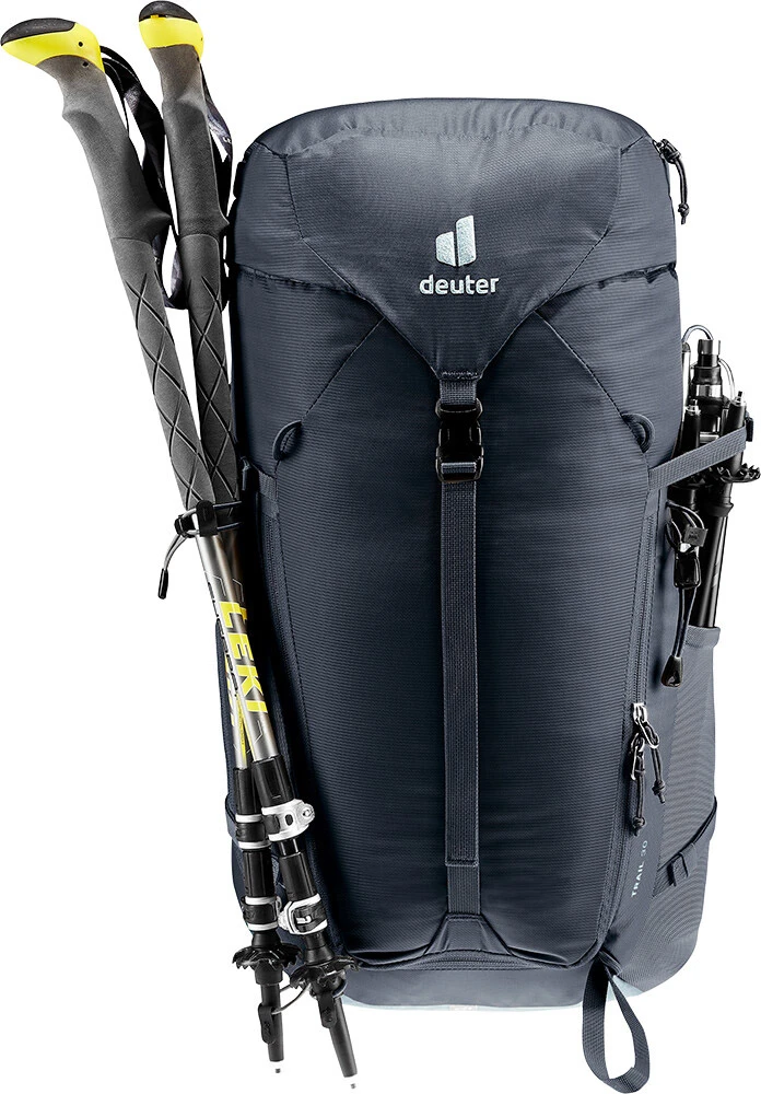 Sportovní bágl Deuter Trail 30: má jednu komorou přístupnou z vrchní části + přes rozměrný otvor zipem. Zádový systém Aircontact Trail System umožňuje odvětrávání pomocí středového tunelu a vaflovité konstrukce. Bederní pás je vysoce prodyšný, je vyrobený ze síťoviny.