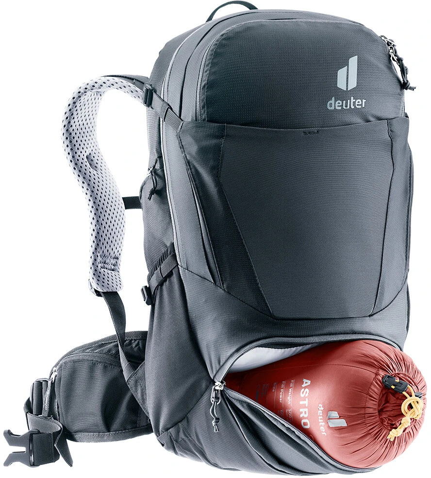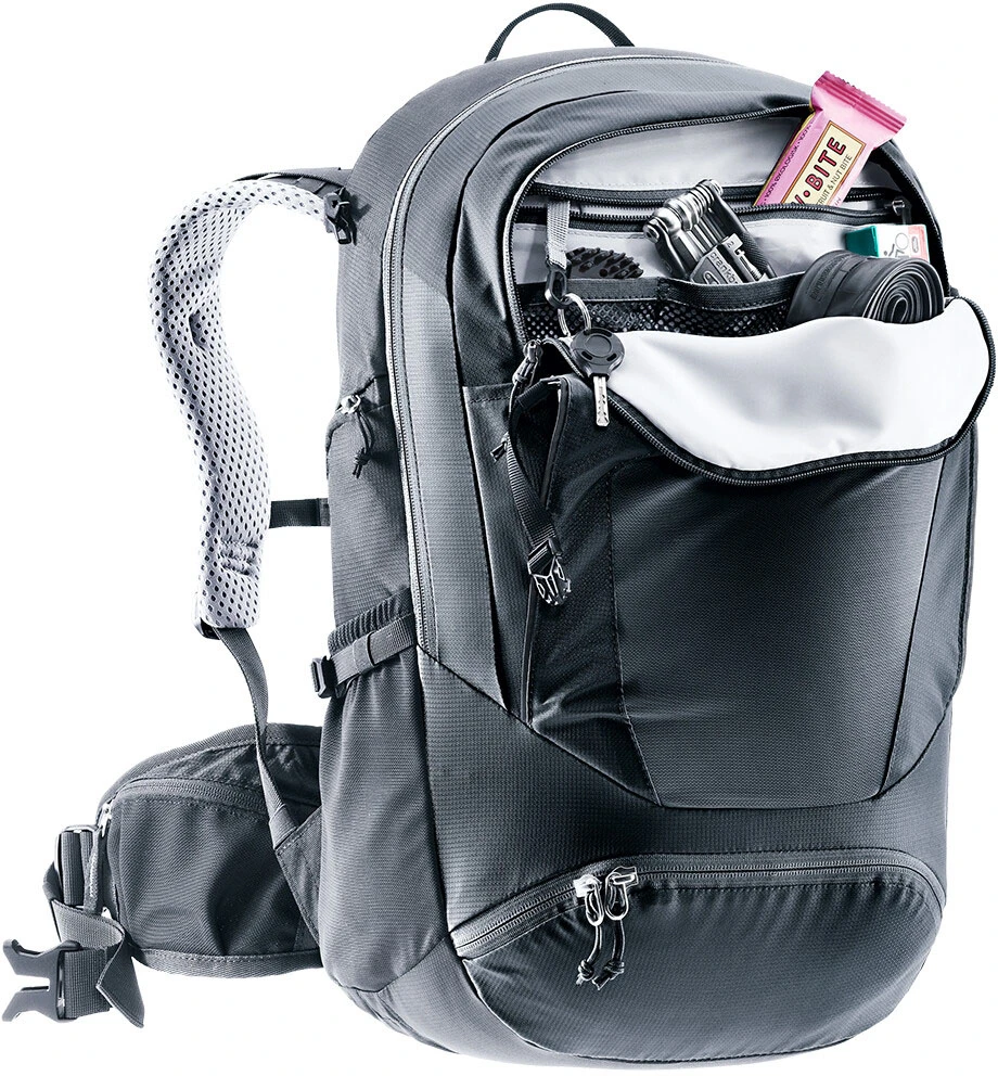 Najdete zde dvě oddělené komory se samostatným vstupem. Spodní komora je oddělena od té vrchní vyjmutelnou přepážkou na zip. Na batohu dále najdete praktický organizér v přední kapse, kapsu na cennosti, dvě boční elastické kapsy a kapsičky na drobnosti na bederním pásu. Vnitřek batohu je také kompatibilní s hydrovakem o objemu 3 litry. Praktickou pomůckou je také přední otevřená kapsa na helmu, lehce přístupná, ale chráněná kapsa na mobil nebo odnímatelná pláštěnka, která vaše věci udrží v suchu i v nepříznivém počasí.