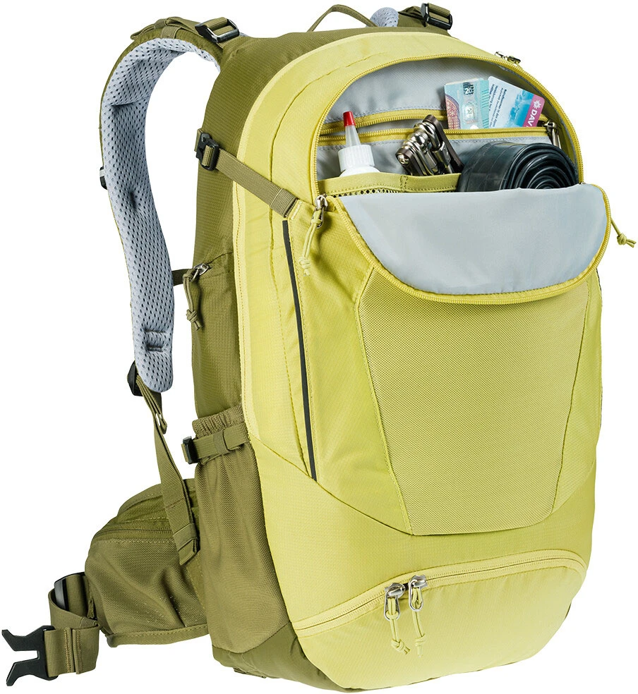 Najdete zde dvě oddělené komory se samostatným vstupem. Spodní komora je oddělena od té vrchní vyjmutelnou přepážkou na zip. Na batohu dále najdete praktický organizér v přední kapse, kapsu na cennosti, dvě boční elastické kapsy a kapsičky na drobnosti na bederním pásu. Vnitřek batohu je také kompatibilní s hydrovakem o objemu 3 litry. Praktickou pomůckou je také přední otevřená kapsa na helmu, lehce přístupná, ale chráněná kapsa na mobil nebo odnímatelná pláštěnka, která vaše věci udrží v suchu i v nepříznivém počasí.