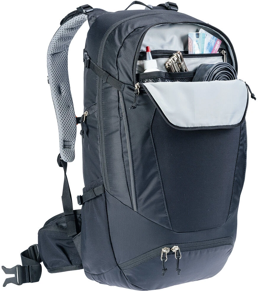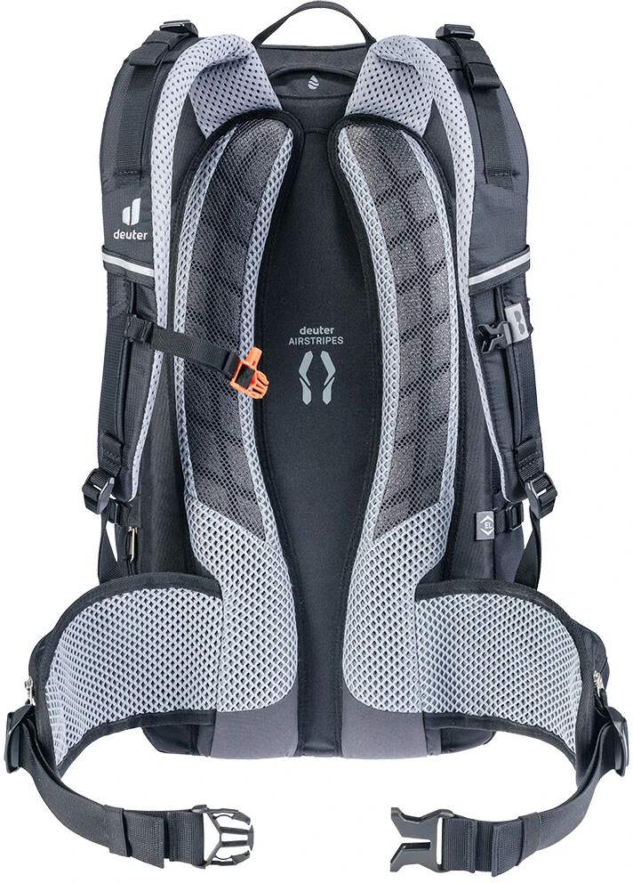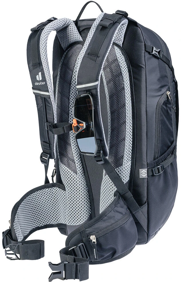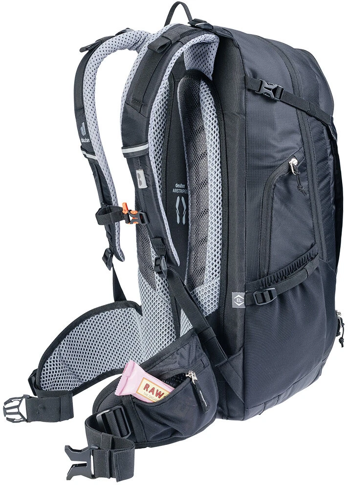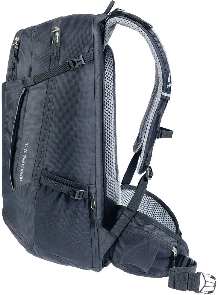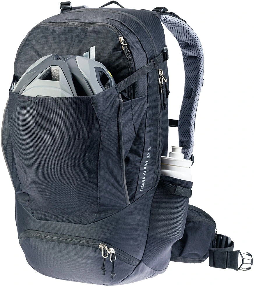 Deuter Trans Alpine 32 EL: Pohodlný cyklistický batoh o objemu 32 litrů. Označení batohu EL znamená, že má batoh prodloužená záda, a skvěle tak padne vyšším osobám (185 - 200 cm). Zádový systém batohu Airstripes je vyztužený kovovou konstrukcí s vysoce prodyšným potahem. Ergonomické polstrované ramenní popruhy lze spojit pomocí výškově nastavitelného hrudního popruhu.