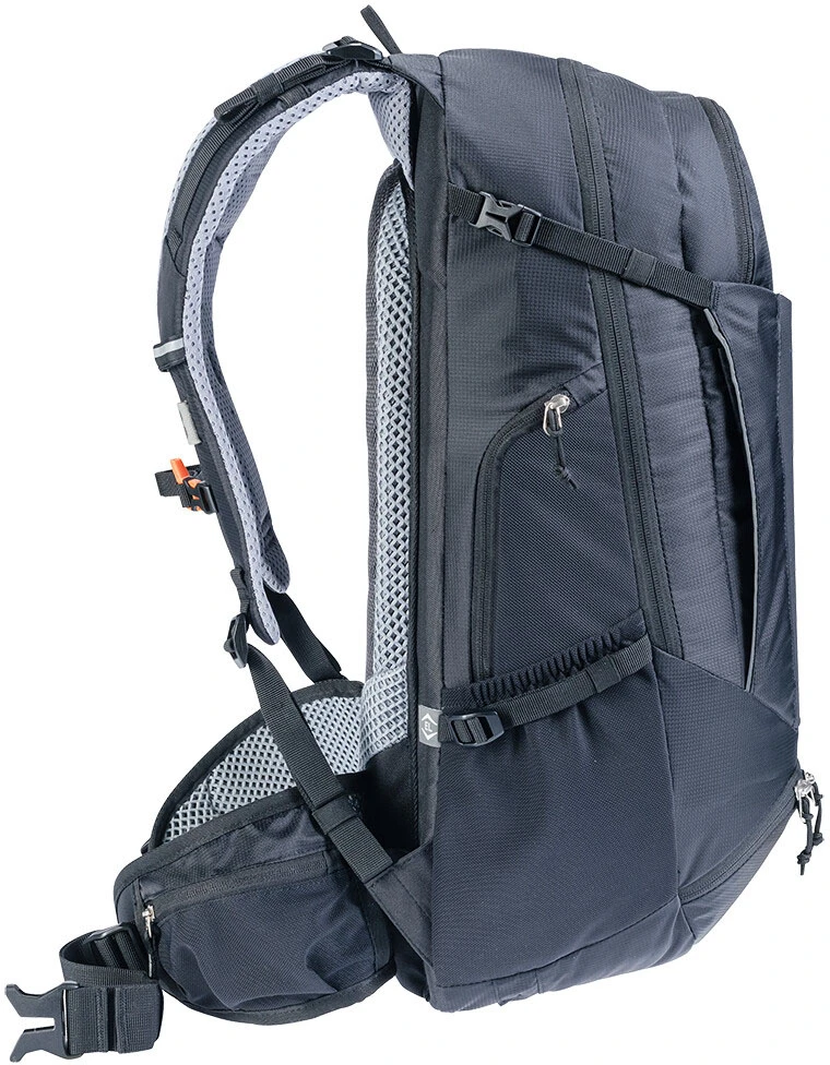 Batoh má dvě oddělené kapsy na zip. Hlavní komora má přístup klasicky z vrchu, a menší spodní skrze přední vstup na zip. Kapsy jsou od sebe oddělitelné vyjmutelnou přepážkou. Dále tu také najdete přední otevřenou kapsu na helmu a malou kapsičku na cennosti, umístěnou na bederním páse. O dodržovaní pitného režimu se postarají dvě elastické boční kapsy na láhve s vodou a vnitřní kapsa na hydrovak o objemu 3 litry. Při nepřízni počasí jistě oceníte odnímatelnou pláštěnku na batoh, poutko na reflektor a reflexní prvky.