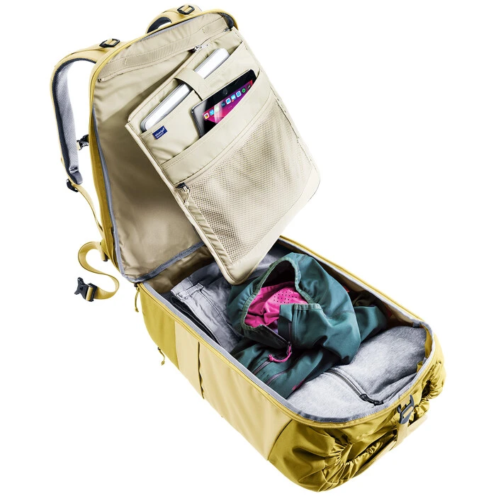 Uvnitř je kapsa na tablet či notebook s obrazovkou do 15". Vstup je přes zip okolo celého batohu pro větší přehlednost, ale i vršek přes zdrhovadlo.
