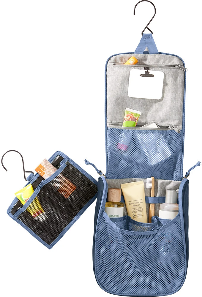 Deuter Wash Center II: toaletní taštička na cesty. Uvnitř hlavní kapsa, dvě kapsy na zip, zrcátko, vyjímatelné pouzdro s vlastním háčkem.