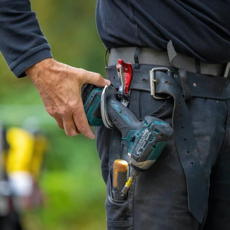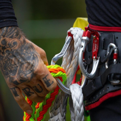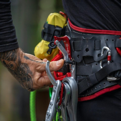 DMM Mega Vault: je pomocná kovová karabina pro pracovní postroj na motorovou pilu, vrtačku a další nástroje. Je kovová, tedy určitě vydrží. Karabinu připevníte imbusovým klíčem.