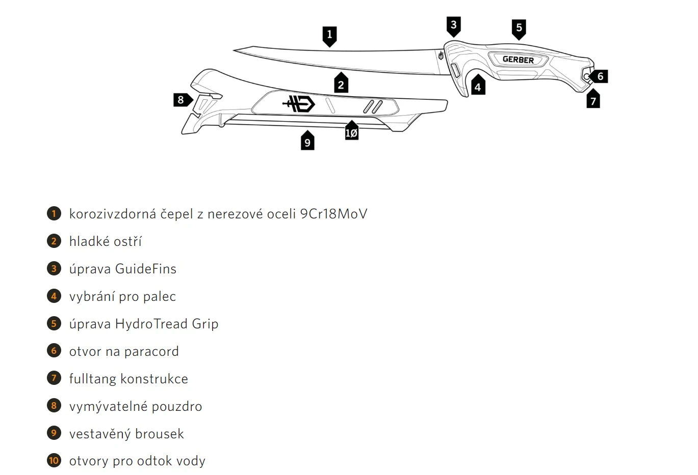 Čepel nože je vyrobena z kvalitní oceli 9Cr18MoV, která je velmi oblíbená pro svoji odolnost a také vysokou tvrdost. Pro snadnou údržbu nože má čepel zrcadlový výbrus, a takzvanou fulltang konstrukci. Ergonomicky tvarovaná rukojeť nože je potažena gumovým povrchem, aby vám pevně a bezpečně seděla v ruce, ve vlhku, i při znečištění. Provedení GuideFins zajišťuje pevné umístění palce, a bezkonkurenční kontrolu nad nožem pro hladké a bezpečné řezy.