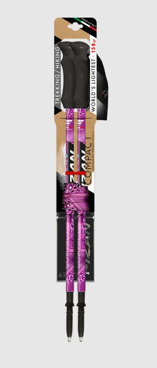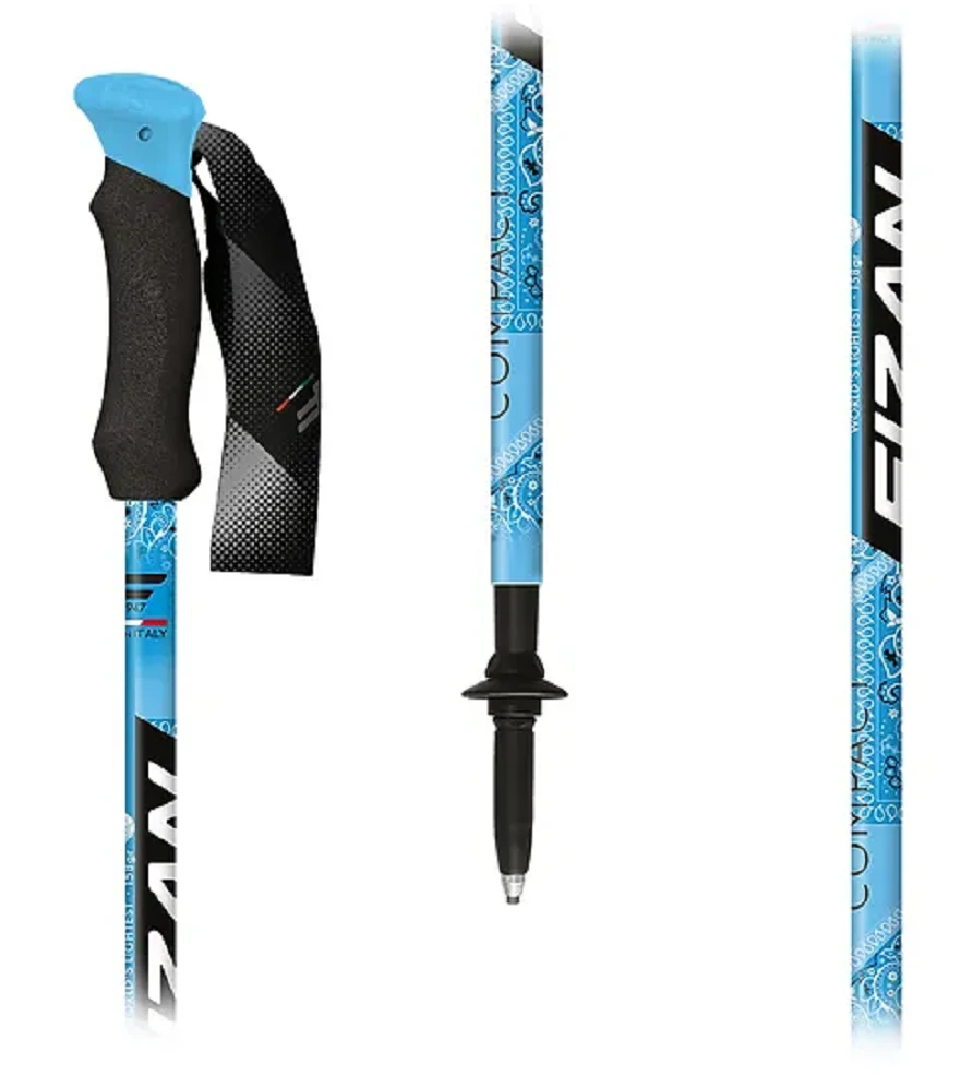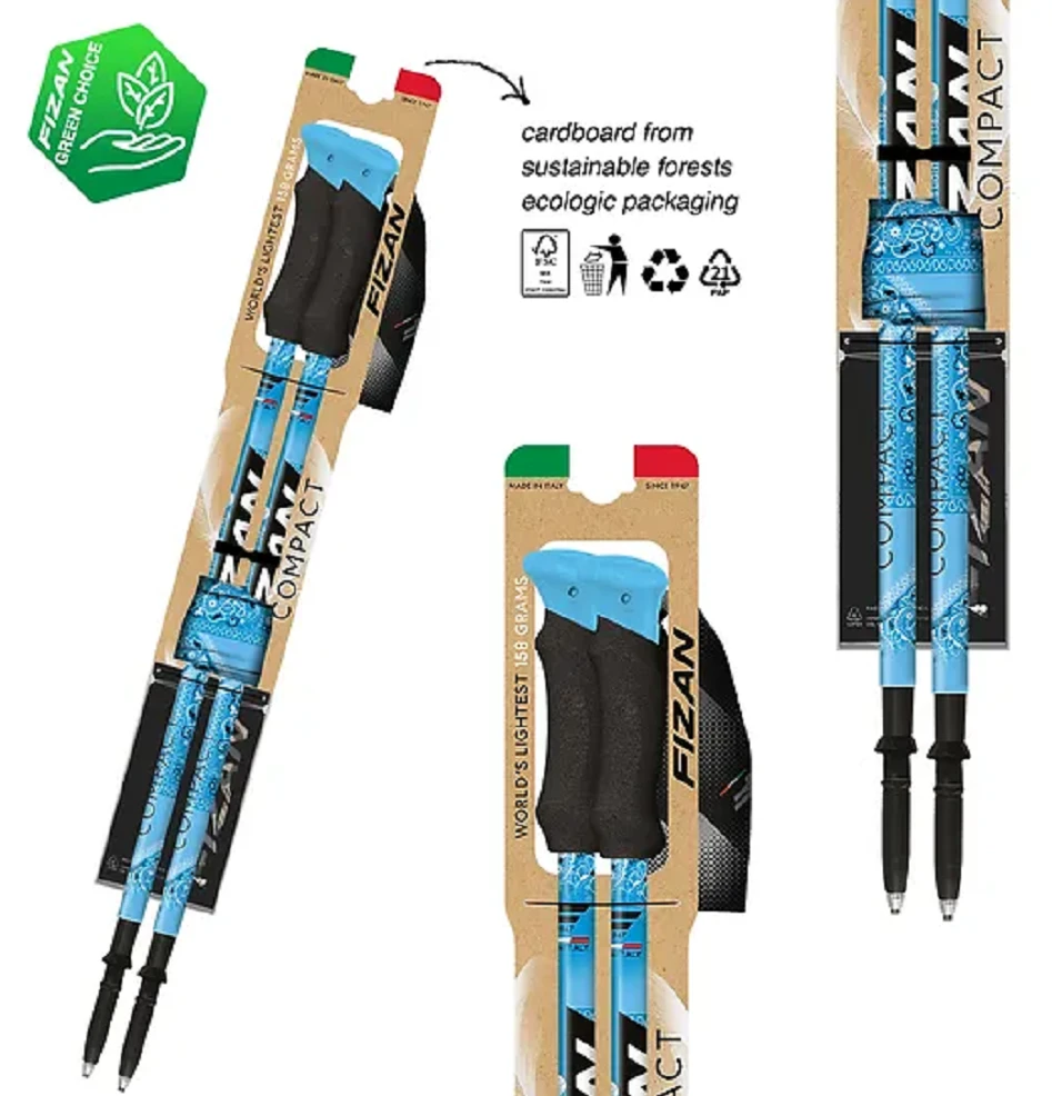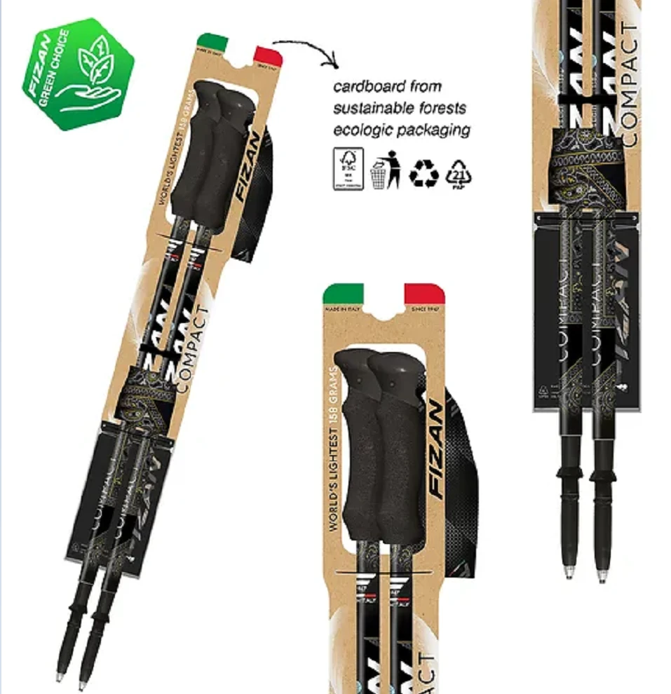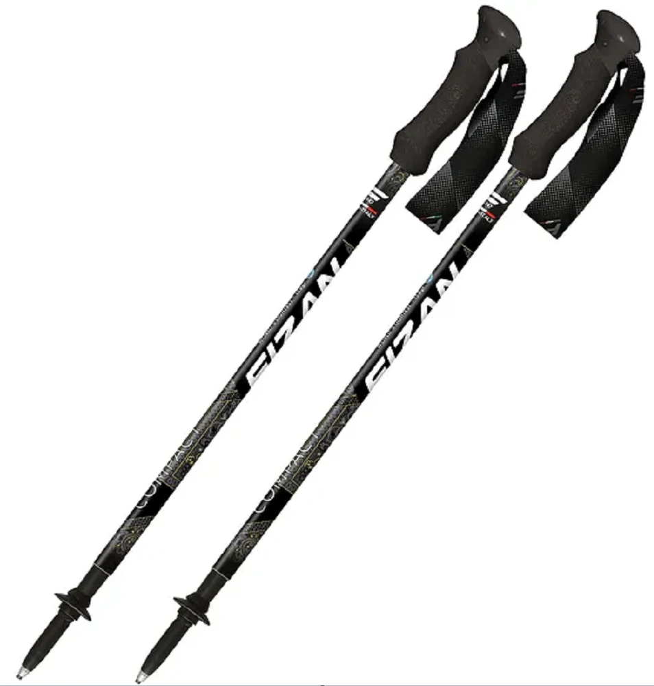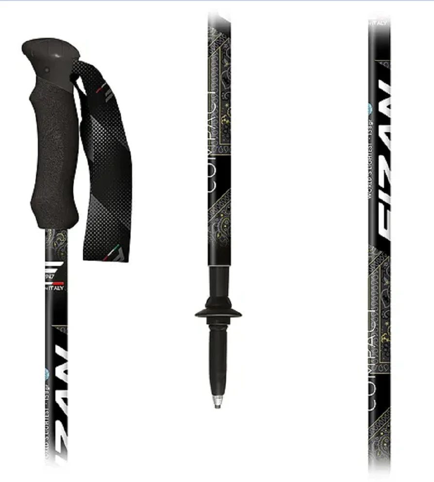 Trekové hole Fizan Compact 3 patří mezi nejlehčí trekové hole na světě (158 g). Hodí se na běžnou turistiku stejně tak dobře jako na VHT. Mají hliníkový hrot s karbidovou špičkou, nastavitelné poutko, 50 mm talířek, ochranný gumový kryt hrotu špice.