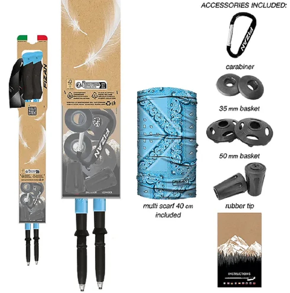 Lehké trekové hole Fizan Compact MS – je set, který obshuje pár ultralehkých hůlek Fizan Compact 3 a multifunkčního šátku.