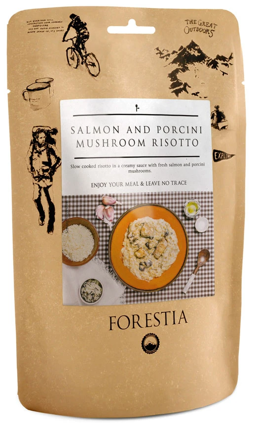 Forestia Lososové rizoto s hříbky: Krémové rizoto s kousky lososa a hříbkovou omáčkou. Jídlo má vyváženou porci živin a bílkovin, díky které vás nabije energií na celý zbytek dne. Jedná se o jednu porci hlavního jídla vhodného na expedici. Jídlo ohřejete pomocí hrnečku studené vody, a speciálního ohřívacího sáčku (součást balení). Díky tomu ušetříte spoustu místa v batohu.