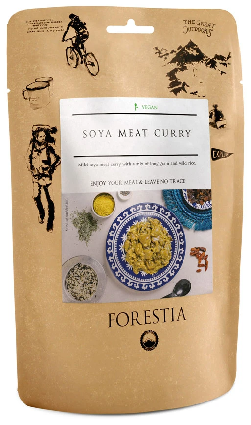 Forestia Sójové curry: Plnohodnotná strava od španělské firmy Forestia, která vám umožní vychutnat si oblíbený pokrm kdekoliv na cestách. Pokrm je vhodný jako hlavní jídlo pro vegany a zároveň i ty, kdo vegani nejsou. Jedná se o hotový pokrm se samoohřevným systémem. Pro přípravu pokrmu nepotřebujete ani vařič s kotlíkem, ani horkou vodu. Postačí vám pouze hrnek studené vody a lžíce. Jídlo se dá konzumovat přímo z obalu.