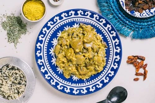 Složení: Dlouhozrnná a divoká rýže 36 %, voda, texturovaná sójová bílkovina 25 %, hrozinky 5 % (hrozinky a bavlníkový olej), slunečnicový olej, kokosové mléko, kari 3,5 % (obsahuje celer a hořčici), sůl a koření.