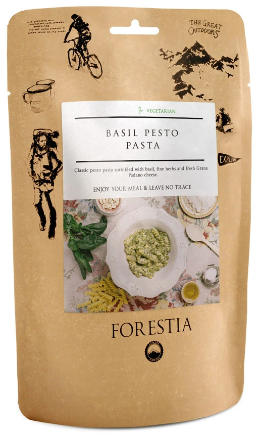 Forestia Těstoviny s bazalkovým pestem: Velice chutné vegetariánské těstoviny s bazalkovým pestem. Lehké a velmi oblíbené jídlo, které vás dobře zasytí po náročné výpravě. Díky speciálnímu systému samoohřevu, nepotřebujete k jeho přípravě vroucí vodu ani vařič. Postačí vám pouze trocha studené vody, kterou nalijete dovnitř a lžíce. Za pár minut máte teplé jídlo, připravené k okamžité konzumaci.