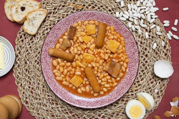 Složení: Voda, bílé fazole 37 %, klobásy 11 % (vepřové a hovězí maso 81 %, vepřový tuk, voda, sůl, koření, extrakty koření, kořenicí přípravky, dextróza, aroma, barvivo: E-120i, stabilizátor: E-450, antioxidant: E-300, kyselina: E-330, E-331, emulgátor: E-472, konzervant: E-250), slanina 8 % (vepřový bůček, voda, sůl, cukr, stabilizátor: E-451i, antioxidant: E- 316, konzervant: E-250), omeleta 6 % (vejce, voda, rýžová mouka, sůl, kyselina: E-300), houby 6 %, rajčatový protlak, cukr, pšeničná mouka, sůl, jablečný ocet (obsahuje siřičitany), pepř a zahušťovadlo: E-415.