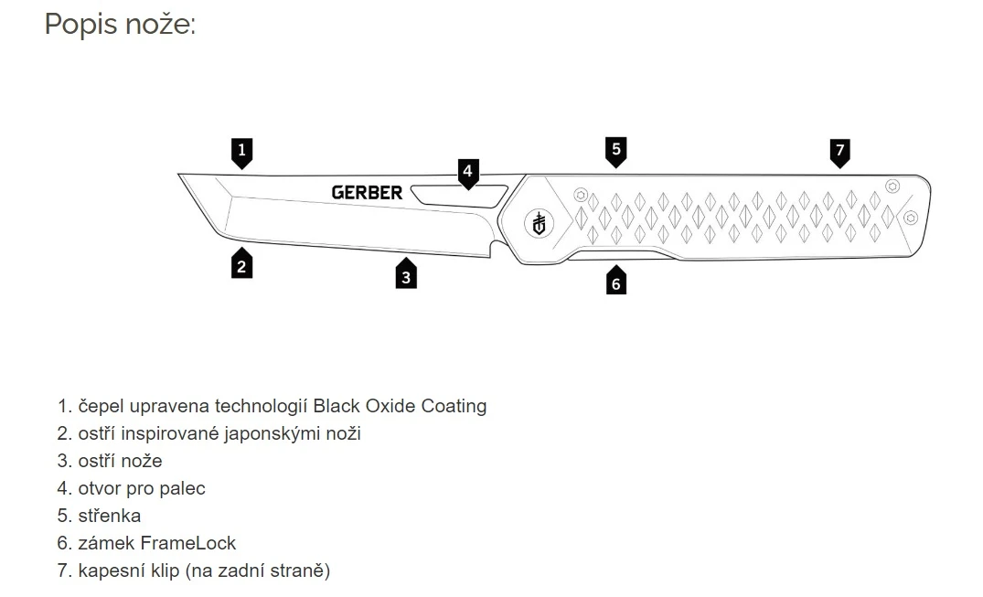 Odolná čepel nože, v elegantní černé barvě je vyrobena z oceli 7Cr17MoV s úpravou Black Oxide Coating. Je zasazena mezi dvě hliníkové střenky, a zajištěna pojistkou Framelock.