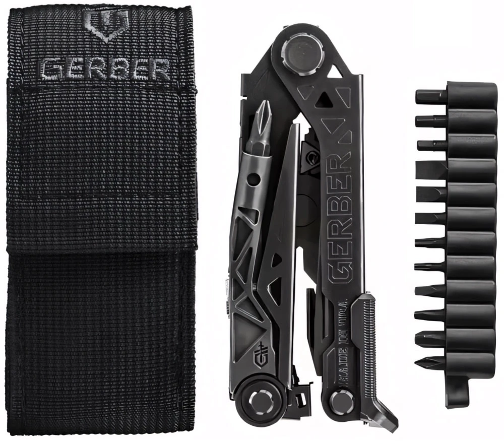 Nástroje: Nástavec na bity / Otvírák na lahve / Vytahovák hřebíků / Pilník / Pravítko / Páčidlo / Křížový šroubovák / Malý plochý šroubovák / Střední plochý šroubovák / Řezák na pásy / Klasické kleště / Velký plochý šroubovák / Nůž s kombinovaným ostřím / Křížový Philips šroubovák / Plochý 1/4" šroubovák / Velký křížový šroubovák / Výměnné karbidové břity / Magnetický nástavec na bity / plochý šroubovák / 1/4 " Hex Bit