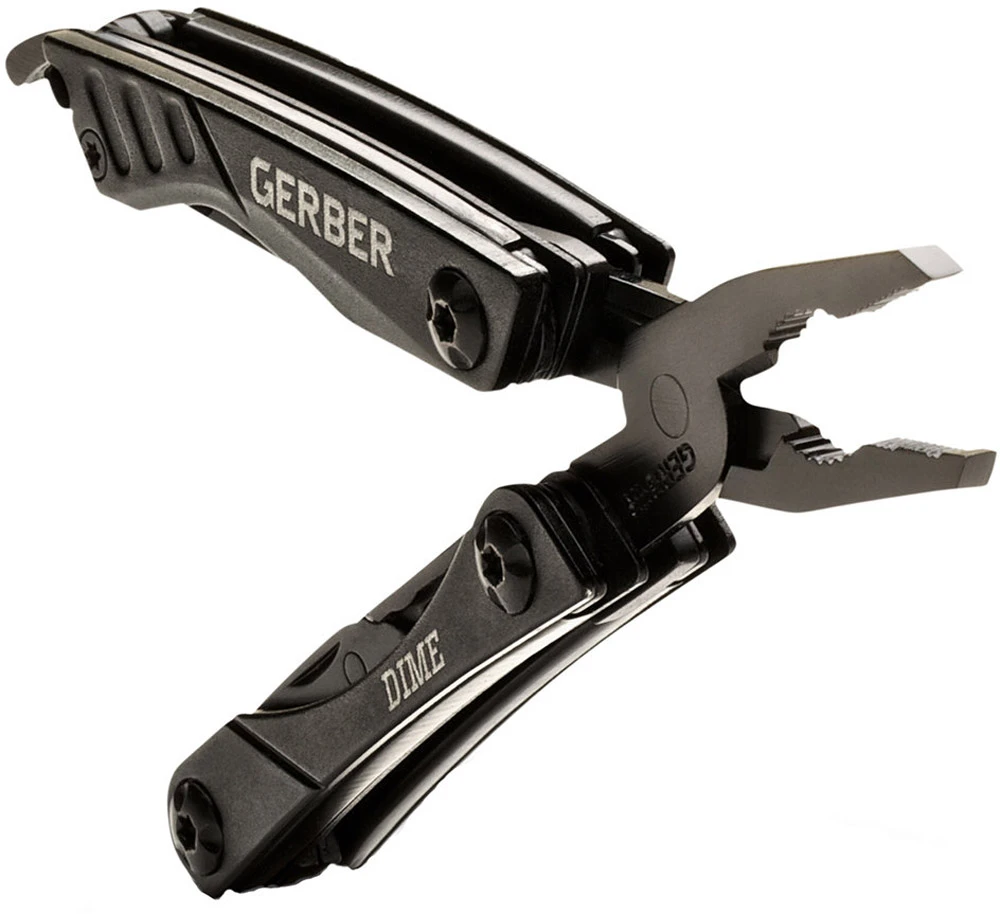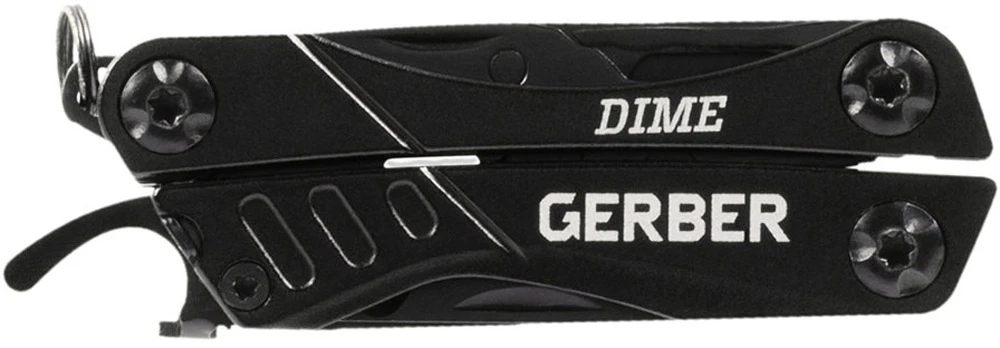Gerber Dime Multifunkční kleště: univerzální nástrojový nůž v kompaktních rozměrech, délka v zavřeném stavu je pouze 7 cm. Jsou to nejmenší multifunkční kleště od Gerberu. Součástí je mnoho praktických nástrojů. Tento multitool je vyrobený z nerezové oceli.