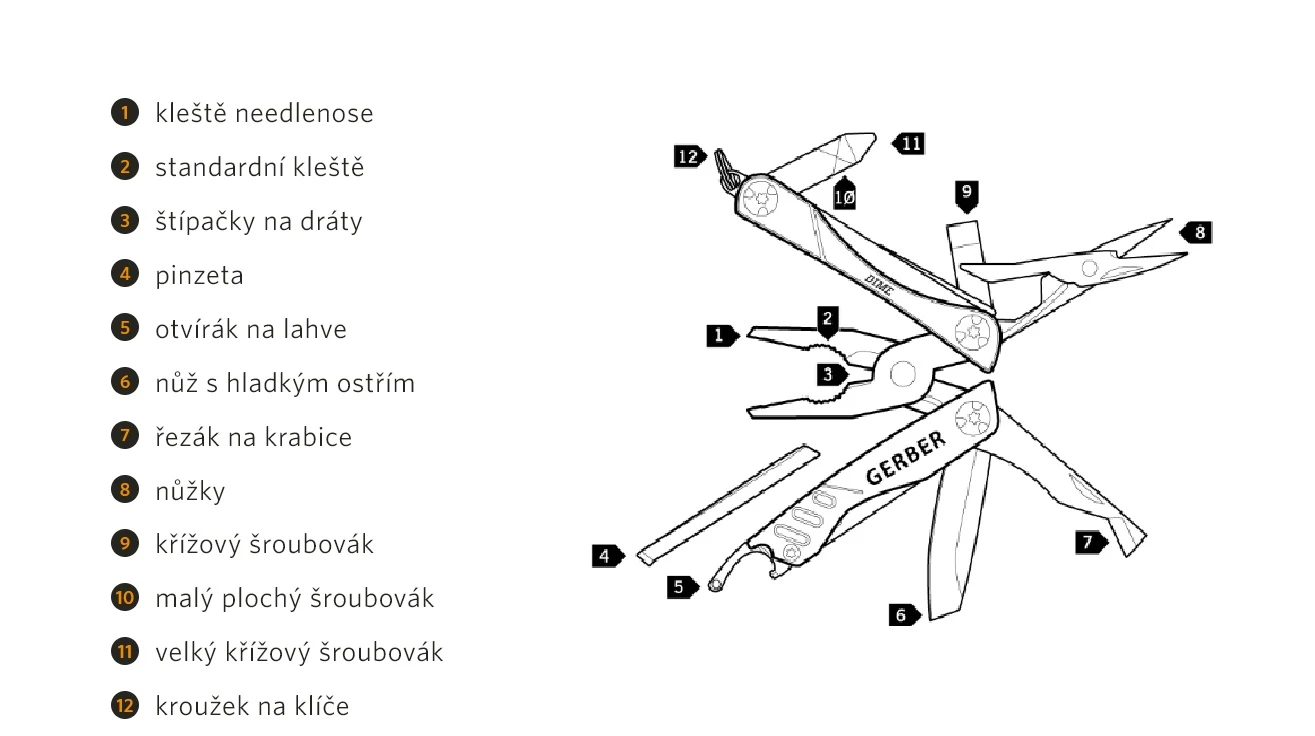 Nástroje: kleště needlenose, nůž s hladkým ostřím, otvírák na lahve, pilník, nůžky, malý plochý šroubovák, pinzeta, řezák na krabice, kroužek na klíče