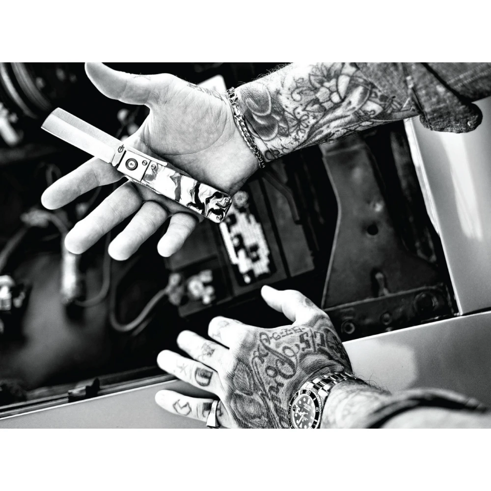 Čepel nože o délce 6,8 cm je vyrobena z kvalitní oceli 7Cr17Mov, ve tvaru sheepsfoot. Je zrcadlově leštěná, a otevírá se pomocí finger flipperu. Díky tomu působí ještě větším Old School dojmem. Střenky nože jsou vyrobeny z akrylátu, v módní tmavě mramorové barvě. Praktickým doplňkem je také klip na uchycení nože k opasku nebo do kapsy.