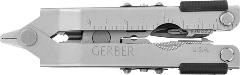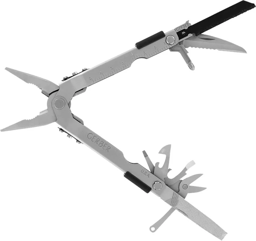 Nástroje: Kleště needlenose / Štípačky drátu / Nůž se zubatým ostřím / Otvírák na lahve / Pilník / Pravítko / Křížový šroubovák / Malý plochý šroubovák / Střední plochý šroubovák / Otvírák na konzervy / Klasické kleště / Lemovač drátů / Pila Remgrit / Nůžky Fiskars