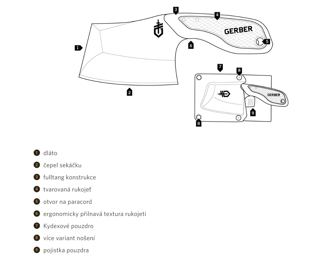 Gerber Tri-Tip Mini Cleaver: mini sekáček od Amerického výrobce, vhodný do lesa i do kuchyně. Hodí se pro vícero způsobů používání. Sekáček je dodáván s kydexovým pouzdrem, díky kterým můžete sekáček nosit dvěma způsoby - rukojetí nahoru, nebo dolů.