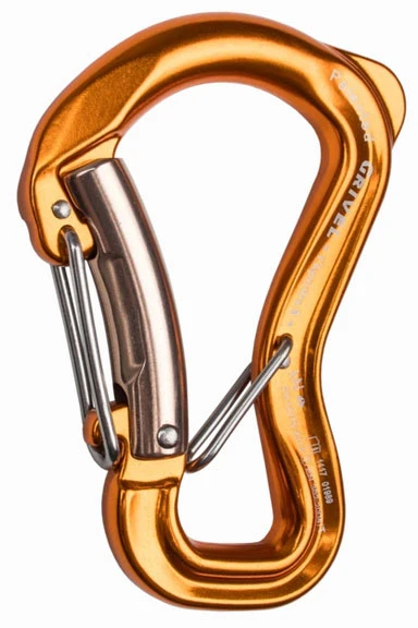 Grivel Clepsydra S: karabina pro spojení s jistícími prostředky se systémem zavírání twin gate. Její výhodou je, že nemá klasickou pojistku, kterou musíte otevřít. Je automatická, sama se zavře. Ale nemusíte nic povolovat. Velmi bezpečné řešení.