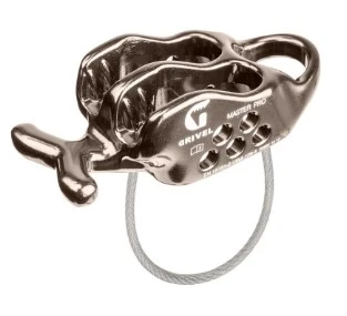Grivel Master Pro: jistící kýbl, který lze využít i při dobírání druholezce shora. Při dobírání druholezce shora slouží nosník k vyvolání páky, odlehčení a uvolnění zamčeného lana.
