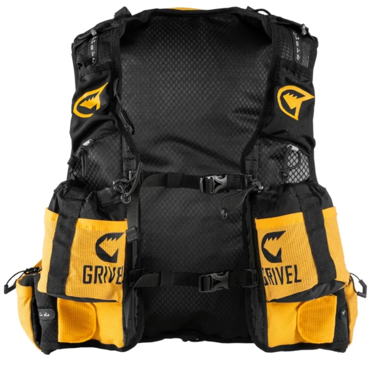 Je vyroben jako vesta s malým batohem na zádech a kapsami na láhve na ramenou. Díky tomu dobře sedí při běhu a neposkakuje.