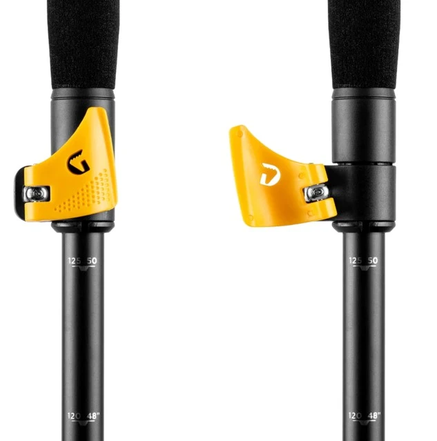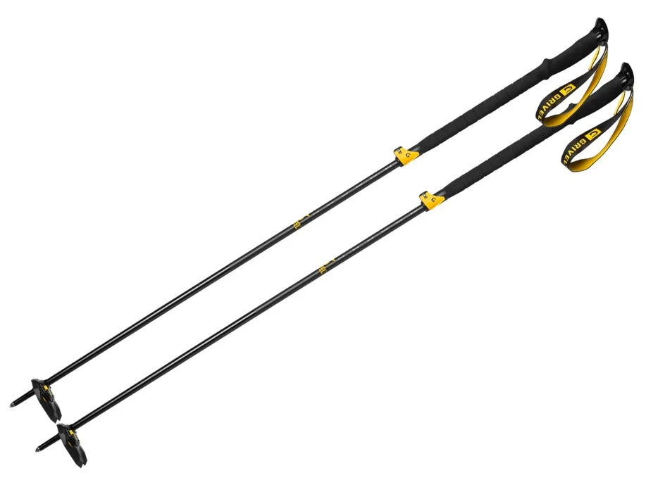 Grivel Ski Tour Vario: dvoudílné hole nastavitelné od 110 do 140 cm, vyrobené z 16 a 14 mm hliníku 7075, vhodné na skialpinismus.