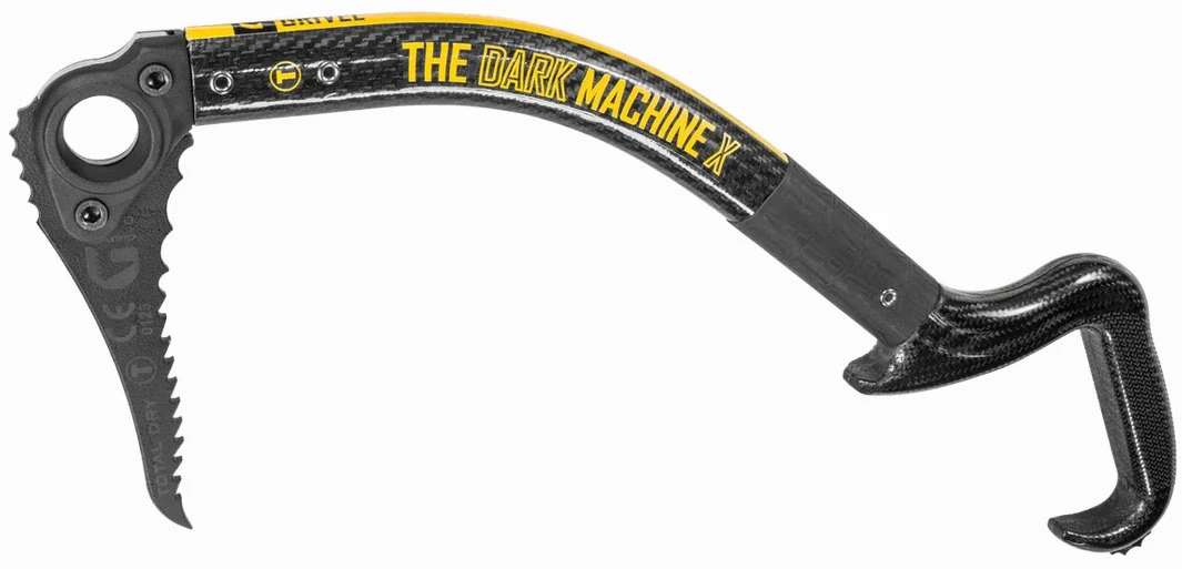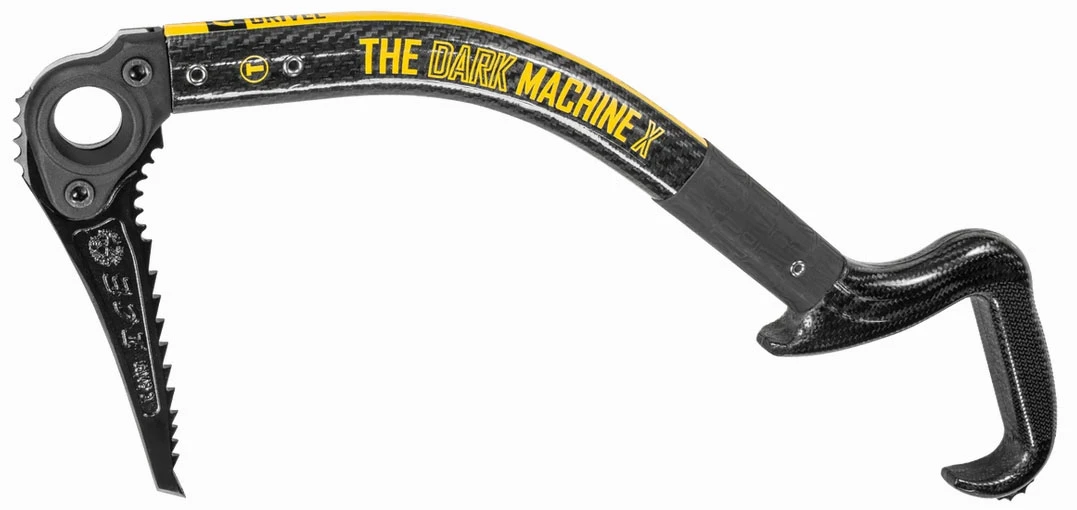 Cepíny Grivel Dark Machine X je vhodný pro těžké linie a velké převisy. Má hodně zakřivenou, anatomicky tvarovanou rukojeť pro co nejlepší úchop. Konec násady má opatřen ochranou prstů před otloukáním, díky tomu lze snadno používat i bez poutka.