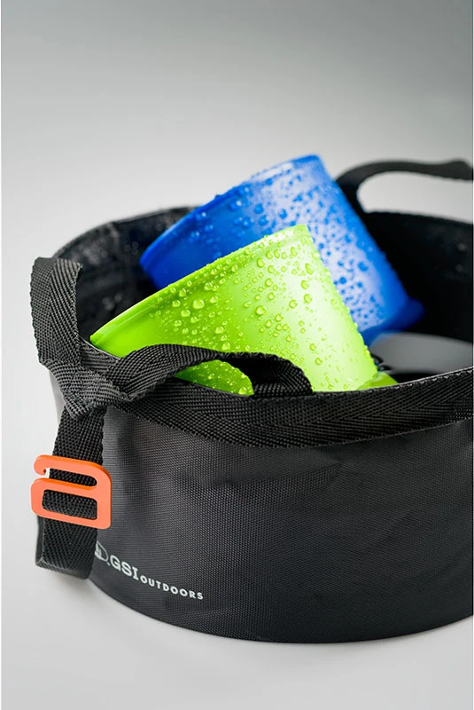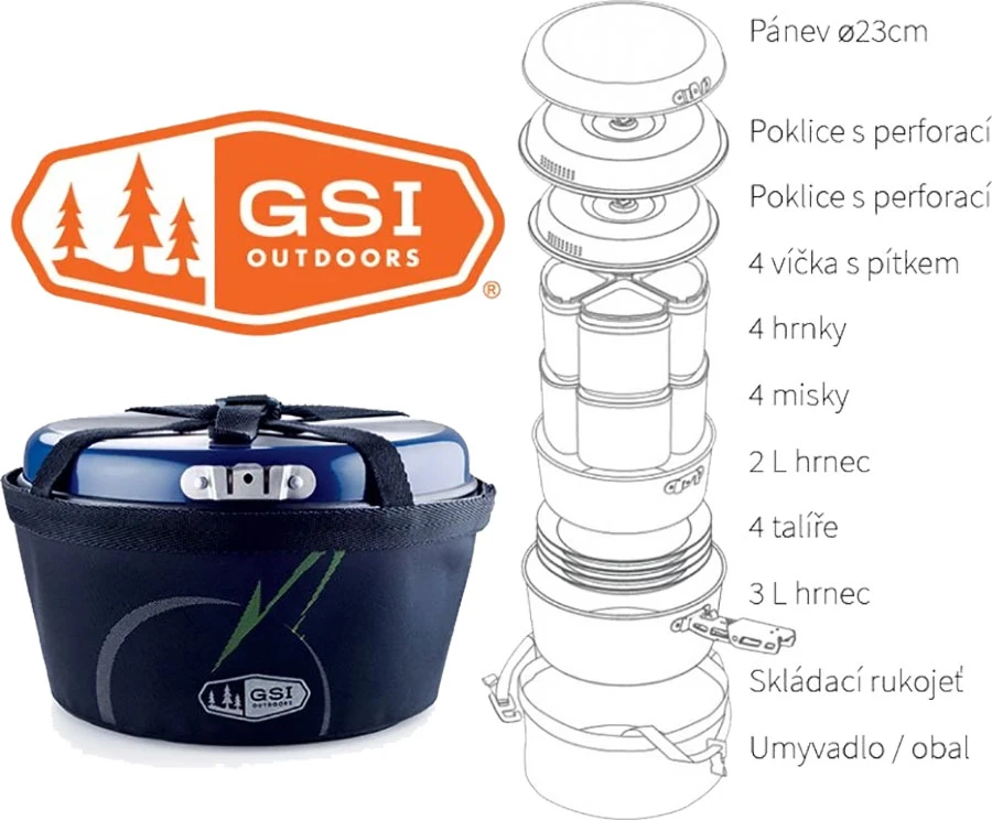 Nádobí je lehké, skladné, sada obsahuje dva hrnce (2 a 3 litry), pánvičku, pokličky, čtyři hrnečky, čtyři misky a čtyři talíře. Vše je uloženo v obalu, který díky pevnému dnu můžete použít jako umyvadlo nebo misku na přenos vody.