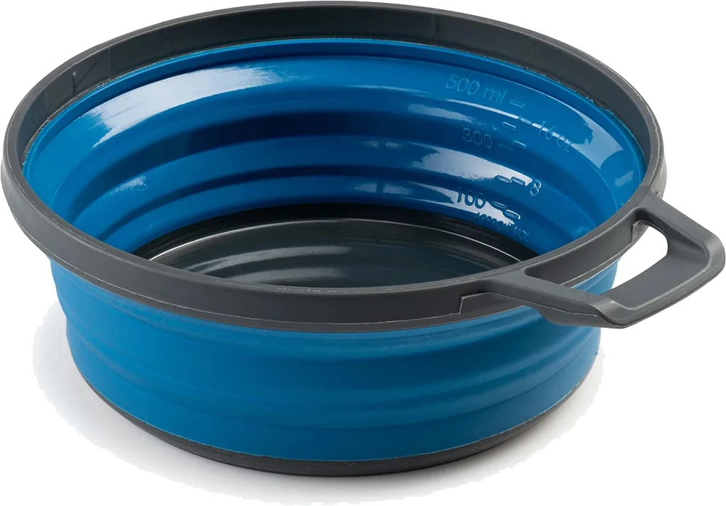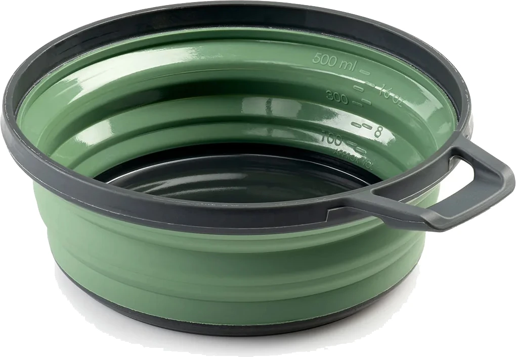 GSI Escape Bowl: skládací miska s uchem na kempování o objedmu 650 ml. Výhodou je možnost složení na „placato“. Díky tomu je miska výborně skladná, minimální výška po složení je 2,4 cm.