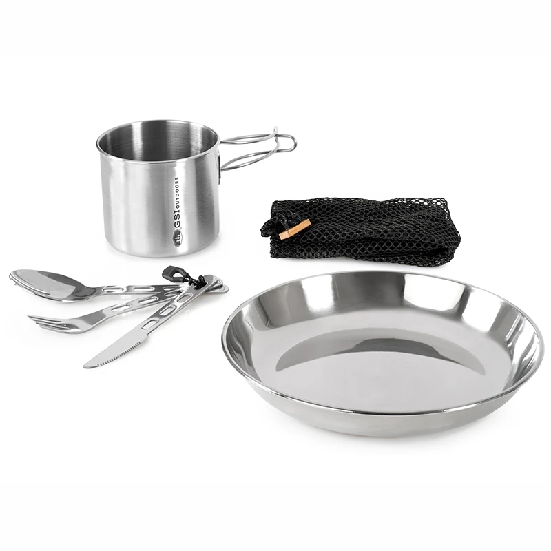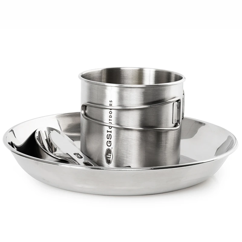 GSI Glacier Stainless 1 Person Set: Velice odolná sada nádobí pro jednu osobu. Hodí se především na výlety a turistiku. Použitá nerezová ocel je zdravotně nezávadná, a odolná proti mechanickému poškození, navíc lze toto nádobí mýt v myčce. Sada se skládá z hlubokého talíře, trojdílného příboru, hrnku se stupnicí a síťky vhodné pro uskladnění a přepravu.