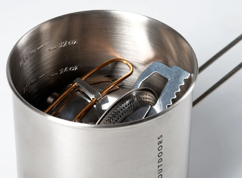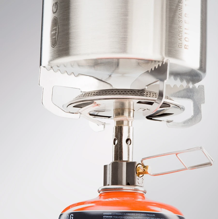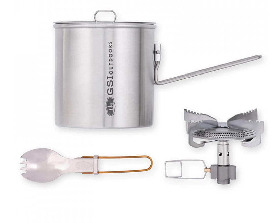 GSI Glacier Stainless Explorer Set: jednoduchá, lehká a kompaktní sada cestovního plynového vařiče a nádobí pro jednu osobu. Hlavní nádoba (kotlík) má objem 1 litr. Kotlík je vyroben z prvotřídní oceli 18/8 Stainless Steel (304), a neobsahuje žádnou přilnavou vrstvu.