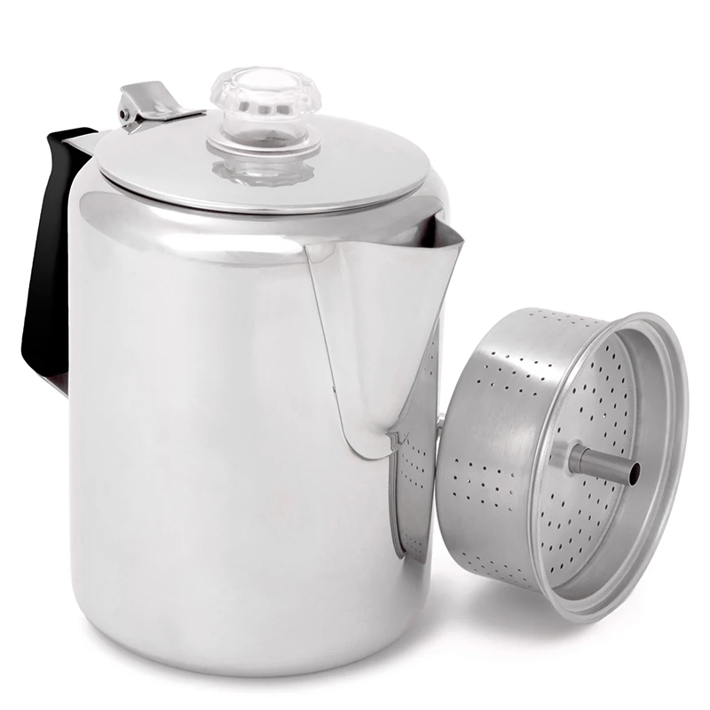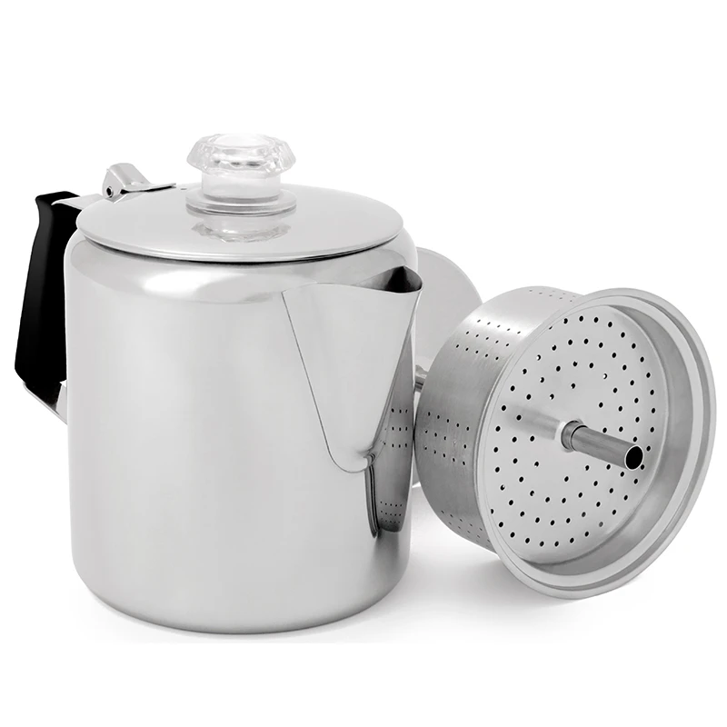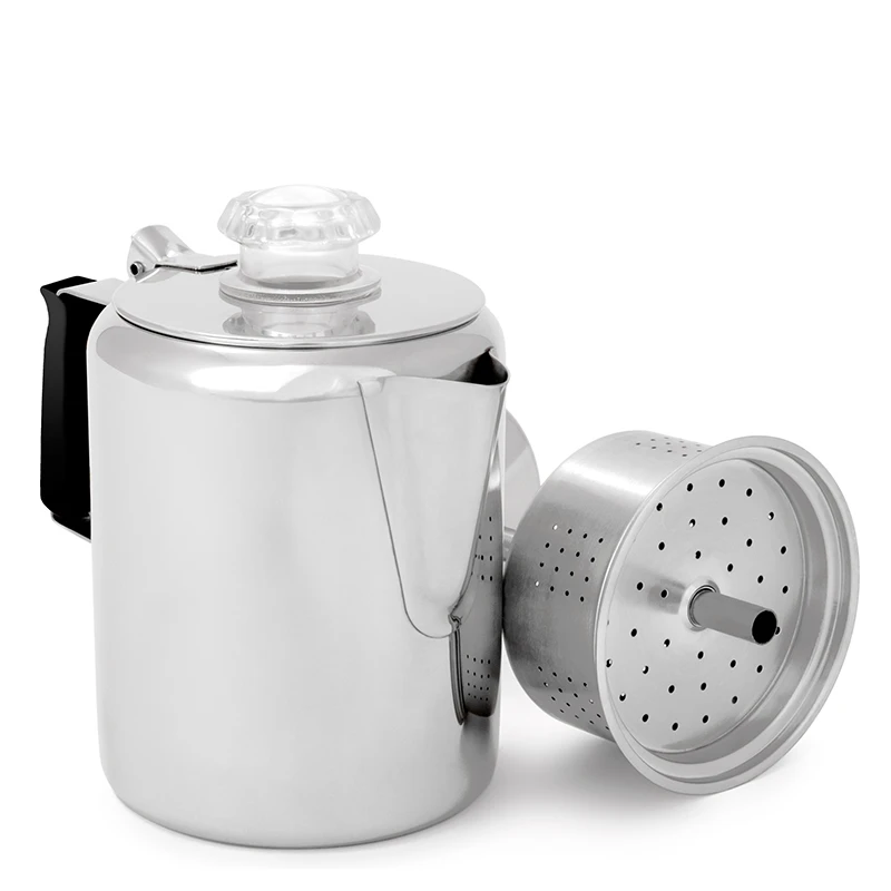GSI Glacier Stainless Percolator: Odolný a robustní kávovar vhodný na cestování, nebo do kempu. Konvice je vyrobena ze zdravotně nezávadné nerezové oceli. Na jejím víčku najdete praktický knoflík PercView, který vám umožní měřit sílu vašeho vaření. Navíc je tepelně odolný, takže se nemusíte bát poranění z opaření. Knoflík zůstává chladný po celou dobu při nalévání kávy. Konvici lze mýt i v myčce.
