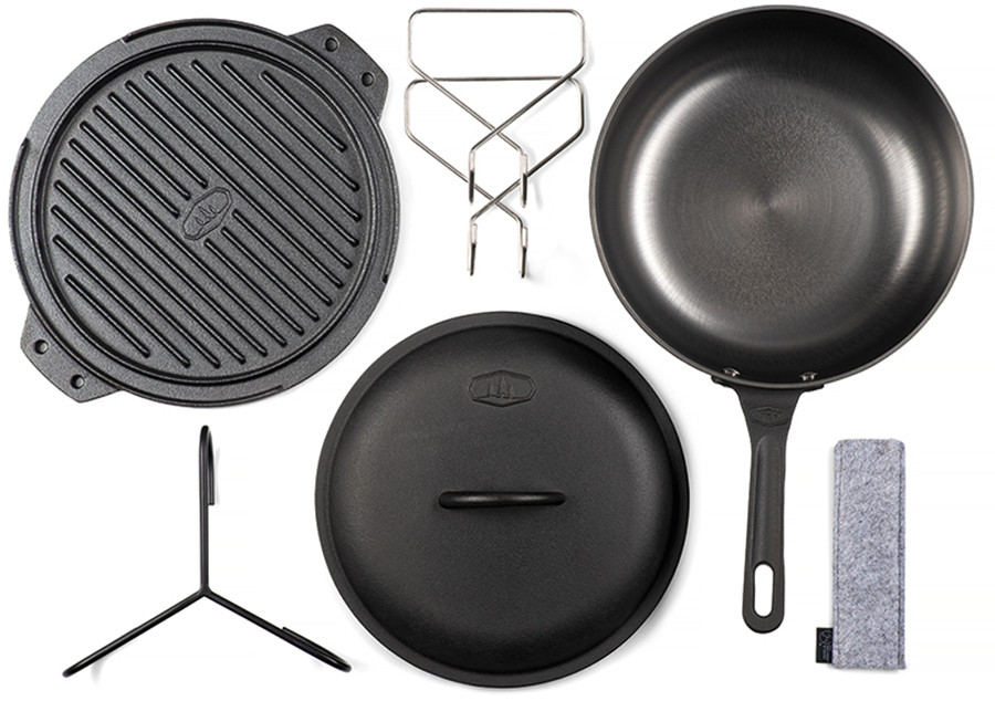 GSI Guidecast Cookset: litinová sada nádobí určená k vaření na otevřeném ohni. V sadě najdete hlubokou pánev o průměru 26 cm s poklicí, či oboustranný litinový plát na kterém snadno připravíte i pizzu. Plát využijete samostatně nebo jako grilovací rošt který vložíte do pánve.
