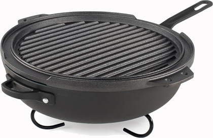 Pánev, poklice a rošt jsou vyrobeny z kvalitní litinové oceli, která vede dobře teplo a je kompatibilní se všemi typy ohřevu - od použití přímého ohně / uhlíků přes indukci až po klasickou elektrickou troubu.